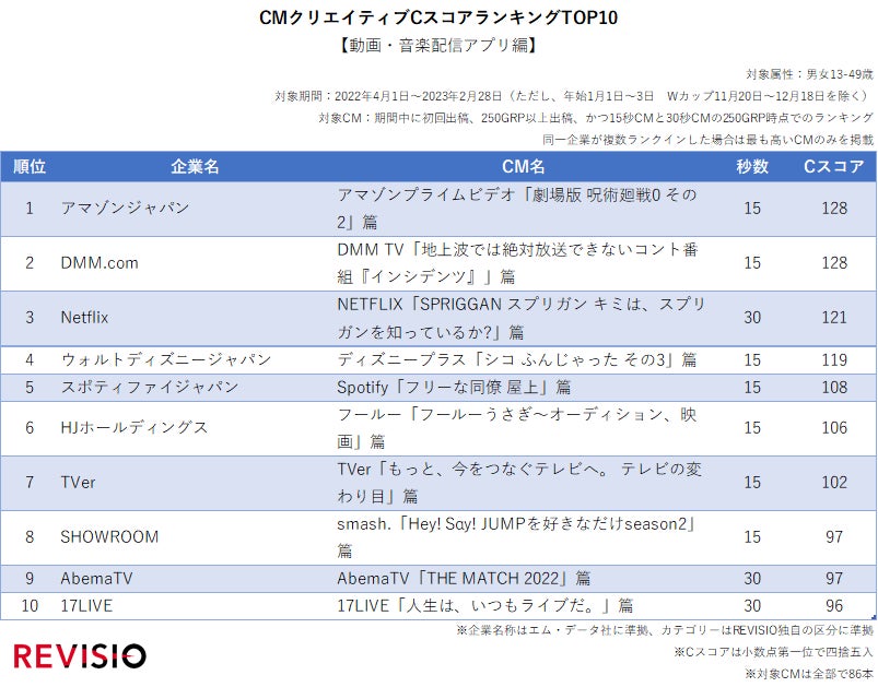 ご家庭に人体認識技術を搭載した機器を設置し、テレビの「視られている量」を測るREVISIO株式会社(旧TVISION INSIGHTS株式会社、所在地 :東京都千代田区、代表取締役社長 郡谷 康士、以下REVISIO)は、2022年4月から2023年2月の期間で、視聴者の視線を釘付けにしたテレビCMのランキング「CMクリエイティブCスコアランキングTOP10【動画・音楽配信アプリ編】」を公開しました。