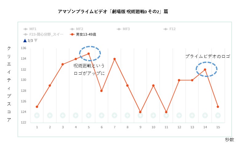 毎秒でのCMの注視は上図となりました。呪術廻戦のロゴ部分で一番注視が高くなりました。呪術廻戦だということが分かり、視聴者の目を惹いたと考えられます。また、いつものプライムビデオの音声とともにロゴが出る部分でも注視があがりました。通常ブランドロゴは注視が下がる傾向があるのに対し、最後のロゴ部分までしっかり見られていました。
