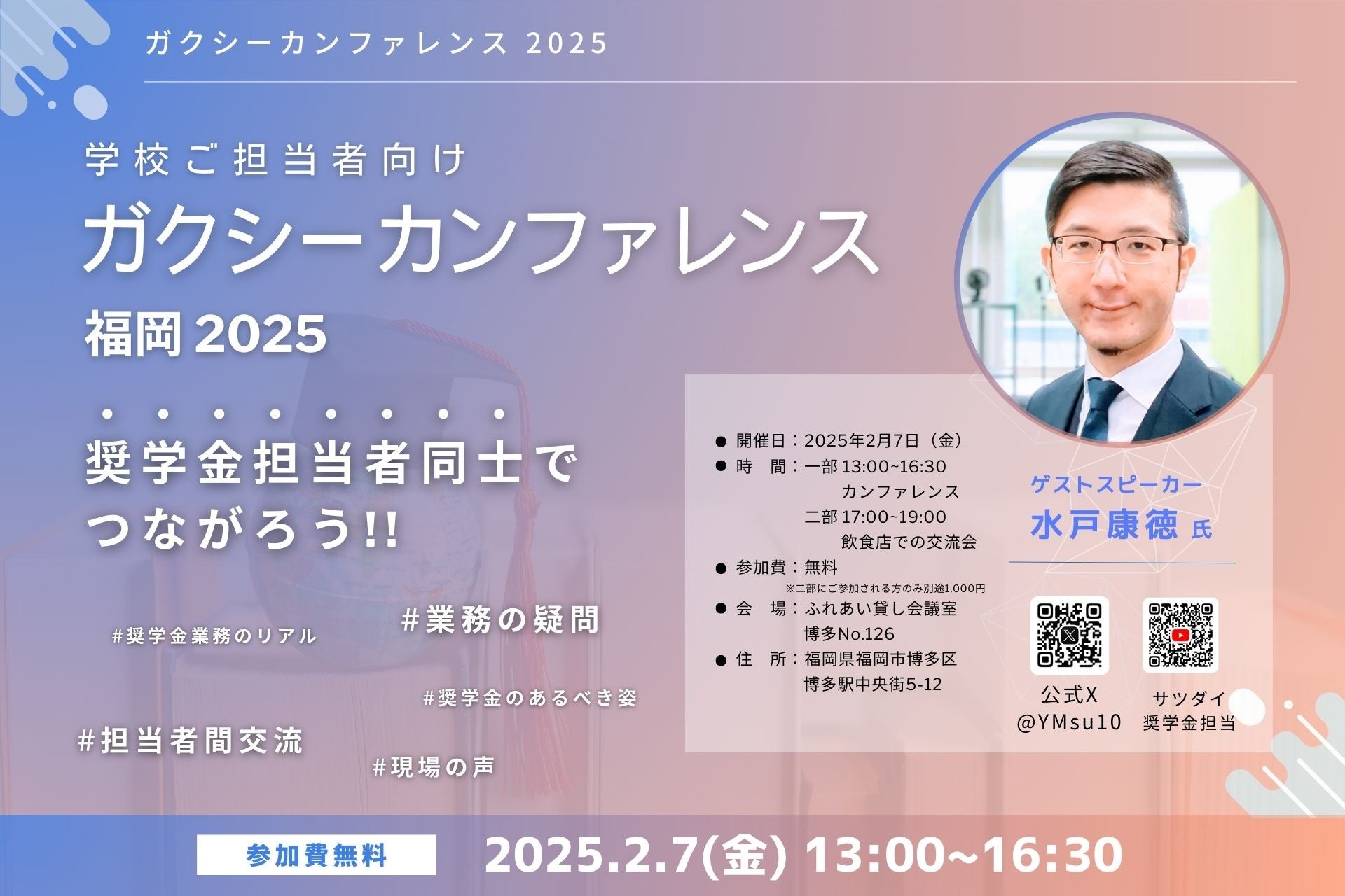 日本最大級の奨学金プラットフォーム「ガクシー」および「ガクシーAgent」を運営する株式会社ガクシー(本社:東京都港区、代表取締役:松原良輔 以下、当社)は、奨学金や授業料減免業務に携わる大学・専門学校の担当者向けのセミナー『ガクシー カンファレンス福岡 2025』(以下、本イベント)を、2月7日(金)に開催します。本イベントは昨年の7月、10月に東京・大阪で開催し、大変好評をいただいたことから九州エリアで追加開催する運びとなりました。