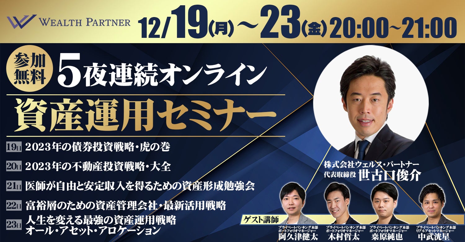 【金融資産から不動産まで2023年の投資戦略を徹底解説】12月19日(月)より『5夜連続オンライン資産運用セミナー』を開催