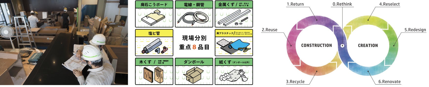 その一つとして、現場で発生する「混合廃棄物」を削減するため、重点8品目の分別を実践。施工会社、解体会社、リサイクル会社、それぞれの立場で役割が分断されるなか、越境しながら対話を重ねることで、資材の調達から施工、リサイクルまでの連携を進め、各社との関係性を深めています。