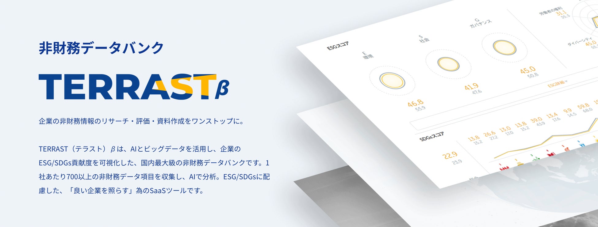 当社は、金融機関やプロファーム、事業会社向けに提供している非財務データプラットフォーム「TERRAST β(テラストベータ)」「TERRAST for Enterprise β」が評価され、「SDGs・ESG」分野で新しい市場をつくる7社のひとつとして選出されました。未来の市場をつくり、社会を変えていくべく、引き続き、サービスの進化に努めてまいります。