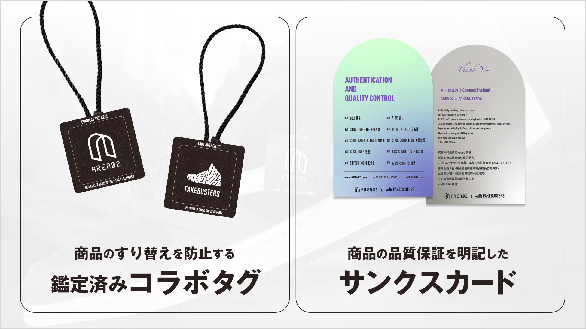 また、AREA 02はグローバル市場への進出や、スニーカー以外のカテゴリへの取り扱い範囲の拡大も視野に入れており、幅広いカテゴリの鑑定に強みを持つフェイクバスターズとの提携により、これらの取り組みが加速すると期待されています。