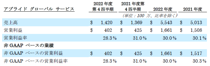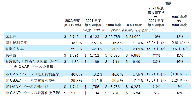 2022年度の売上高は257億9,000万ドルでした。GAAPベースでは、売上総利益率46.5%、営業利益77億9,000万ドル(売上高の30.2%)、1株当たり利益7.44ドルでした。