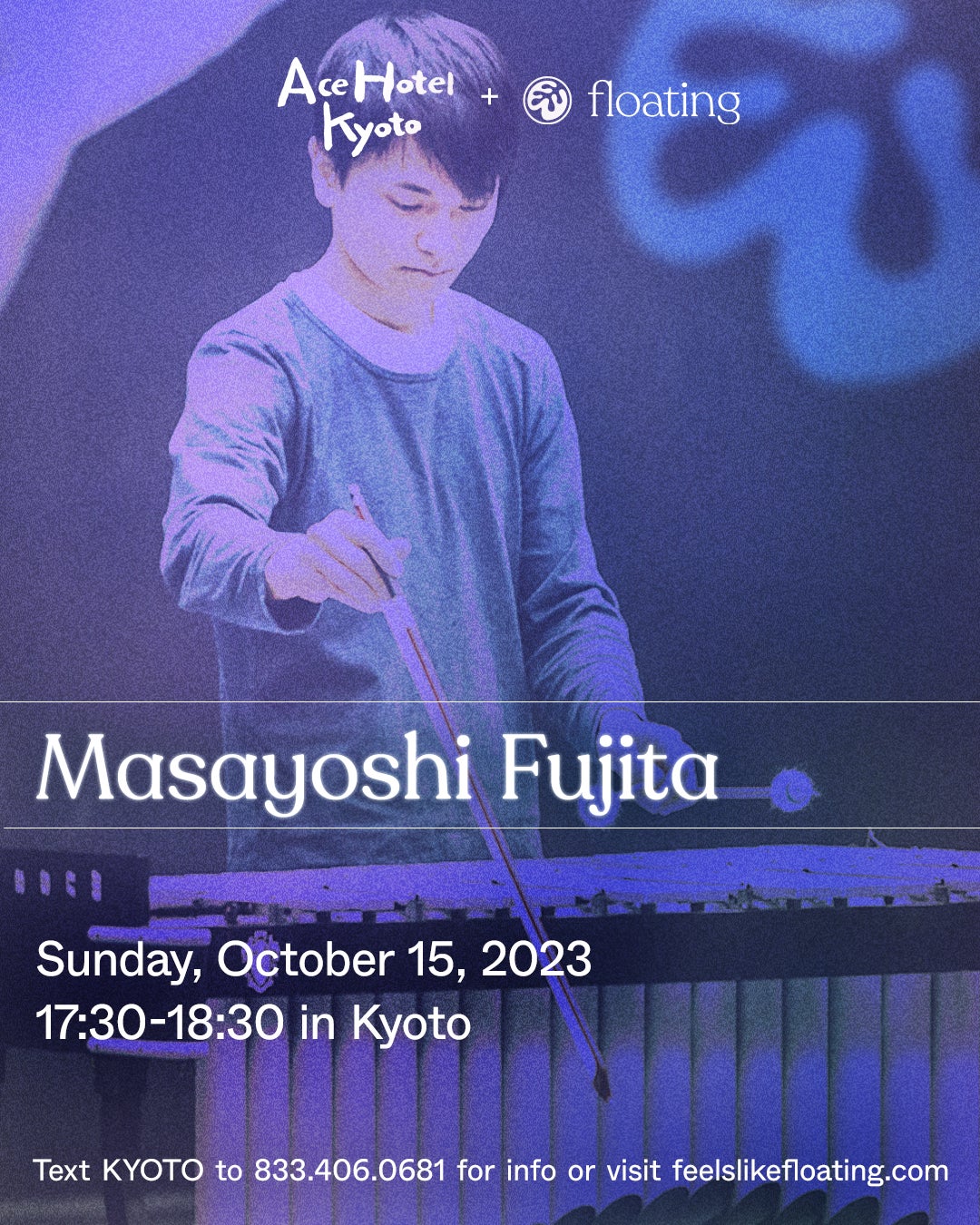 去る10月5日(木)、 Leaving Recordsは、ロサンゼルスを拠点に活動するアンビエント・アーティスト Diva Dompe と、エレクトロニック・ミュージシャン Michael Flanaganのスペシャルライブをエースホテル京都ロビーにて開催し、本プロジェクトの幕開けを演出しました。これを皮切りにし、次にFloatingは、10月〜12月の3カ月間、第3日曜日にエースホテル京都のロビーにて世界的に活躍する音楽パフォーマーを迎え、ライブを催します。Floatingは、ロサンゼルスを拠点に毎月開催されている野外アート・シリーズで、音楽のサウンドと視聴環境の調和を探求し表現される先進的な音楽パフォーマンスは絶大なる人気を博しています。10月15日(日)には、ヴィブラフォン、マリンバ奏者であり、作曲家の藤田 正嘉(ふじた・まさよし)氏を迎え、音楽の新境地を追求する音の世界へ誘います。ぜひこの機会に唯一無二の音楽視聴の体験をお楽しみください。11月19日(日)と12月17日(日)の出演アーティストについては、近日発表を予定しています。 (入場は全て無料)