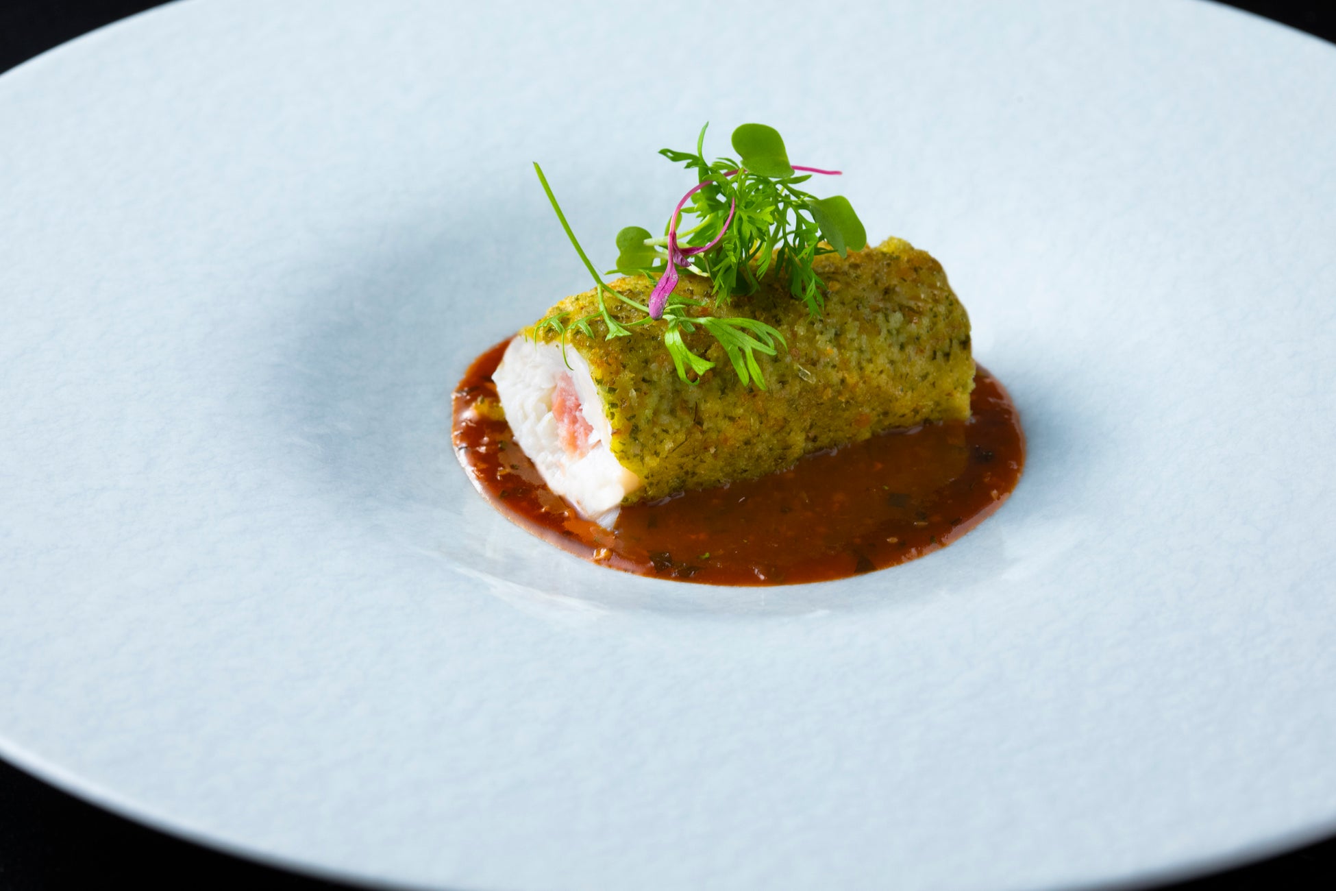 魚料理は、旬のヒラメと白子を使用した芳香豊かなペルシャード仕立て。エストラゴンの香りと、ホワイトポートを使ったソースが食材の繊細な