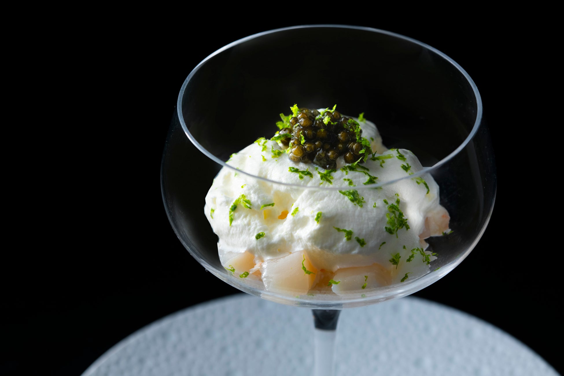 重ねた一皿。滑らかなエスプーマ仕立てにキャビアを添え、素材の上品な旨味とともに冬の訪れを感じる見た目も華やかな前菜に仕上げました。