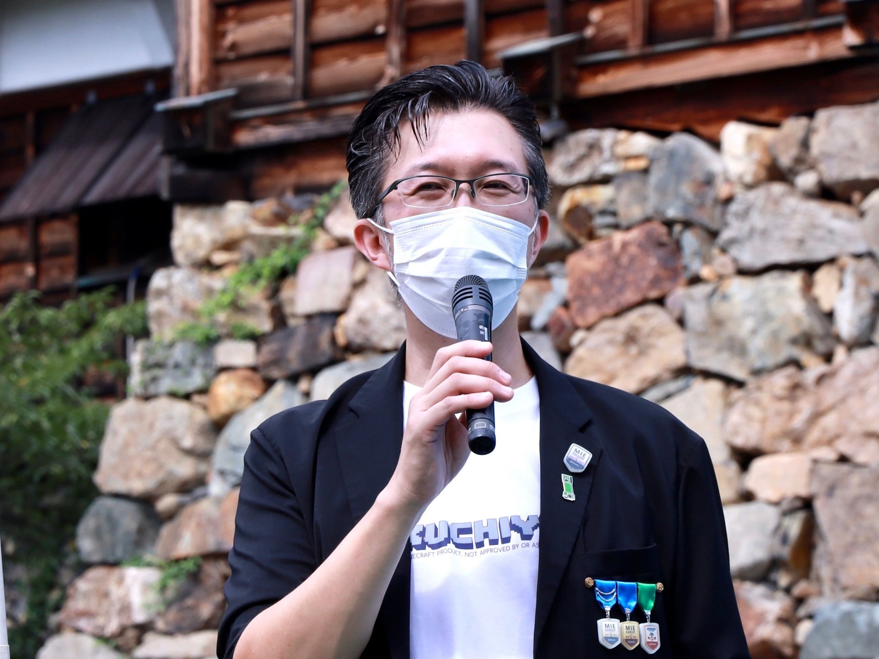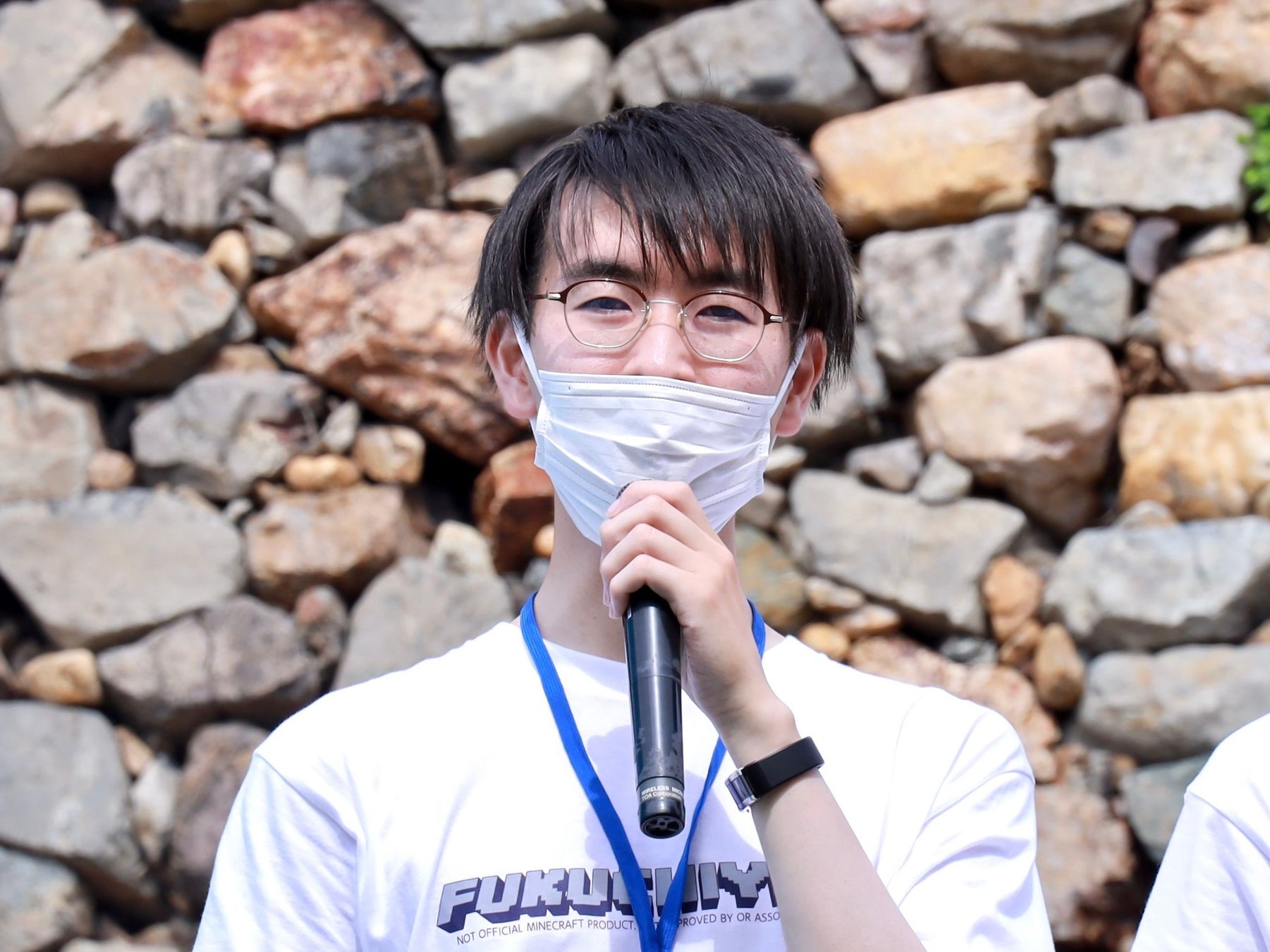 8月16日(火)に、福知山城にて「福知山城マインクラフト」のお披露目会が行われました。約10カ月間「福知山城マインクラフト」の建築に取り組んできた、福知山公立大学情報学部の学生12人が、オリジナルデザインのお揃いのTシャツに身を包み登場しました。続いて、本プロジェクトを監修いただいた、プロマインクラフターのタツナミシュウイチさんにも登壇いただきました。