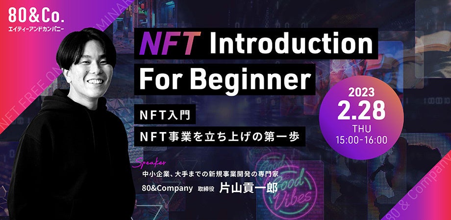 「なんとなくは理解できていても説明はできない」「参入したいがどうしたらいいのかわからない」などNFTについて興味はあっても理解しきれていない方も多いのではないでしょうか。そこで、パッケージシステム「NFT INFINITY」の提供や、新規事業開発・システム開発を行う株式会社80&Companyがオンラインにて「NFT入門 NFT事業立ち上げの第一歩」を開催いたします。質疑応答の時間も設けているので、NFTについて少しでも興味がある方はぜひこの機会にご参加ください。