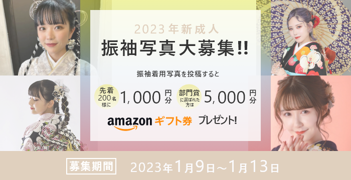 My振袖に振袖着用画像を投稿して頂いた先着200名様に、Amazonギフト券1,000円分、各部門賞に選ばれた方にAmazonギフト券5,000円分をプレゼントいたします。部門は「コーディネート部門」「前撮り部門」「ヘアメイク部門」の3つです。