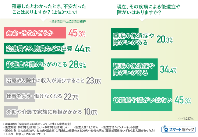 罹患することで収入が減ってしまう場合も多い一方、治療や手術などに多額の費用がかかり、さらには逸失収入が発生するなど、多くの経済的リスクに直面することが明らかになりました。