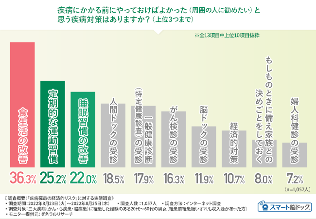 食生活や運動、睡眠といった生活習慣の改善をしておけばよかったと感じている方が上位を占め、さらには人間ドックの受診に加えて脳ドックやがん検診などのオプション検査の受診も疾病対策として大切だと回答する方も多くみられました。