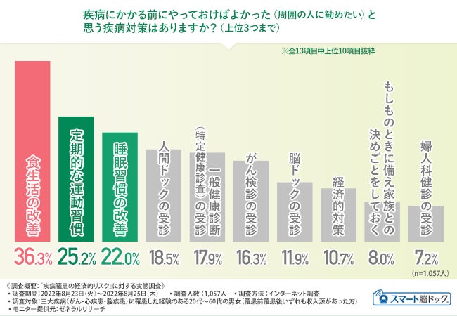 「疾病にかかる前にやっておけばよかった(周囲の人に勧めたい)と思う疾病対策はありますか?(上位3つまで)」と質問したところ、『食生活の改善(栄養バランス、食事量、アルコールのとり方など)(36.3%)』が最多となり、以降『定期的な運動習慣(25.2%)』『睡眠習慣の改善(規則正しい睡眠、十分な睡眠時間をとるなど)(22.0%)』『人間ドックの受診(18.5%)』『一般健康診断(特定健康診査)の受診(17.9%)』『がん検診の受診(16.3%)』『脳ドックの受診(11.9%)』『経済的対策(将来を見据えた貯蓄、資産運用、保険加入など)(10.7%)』『もしものときに備え家族との決めごととしておく(8.0%)』『婦人科健診の受診(7.2%)』『内視鏡検査の受診(7.0%)』『その他オプション検査の受診(3.6%)』と続きました。〈図6〉