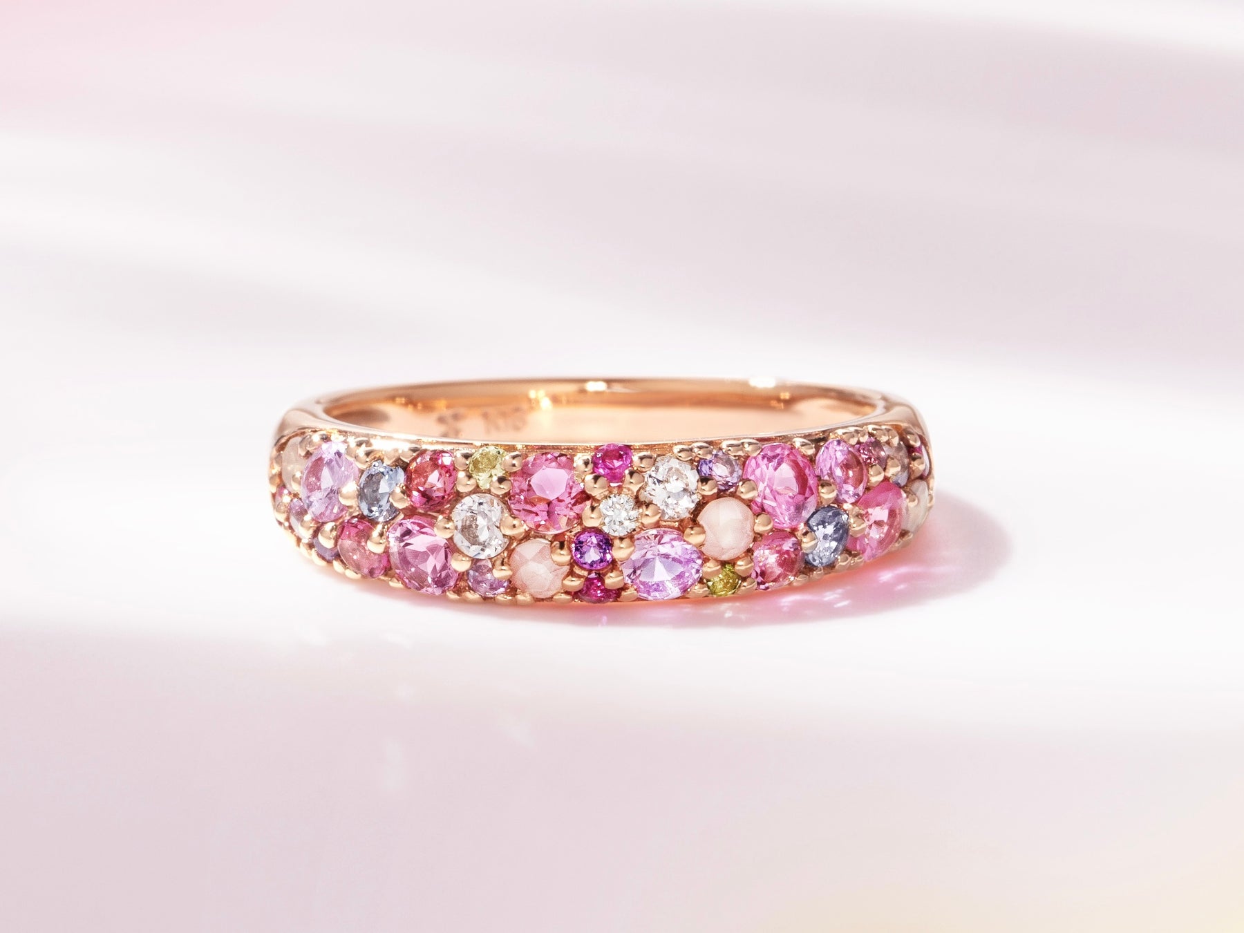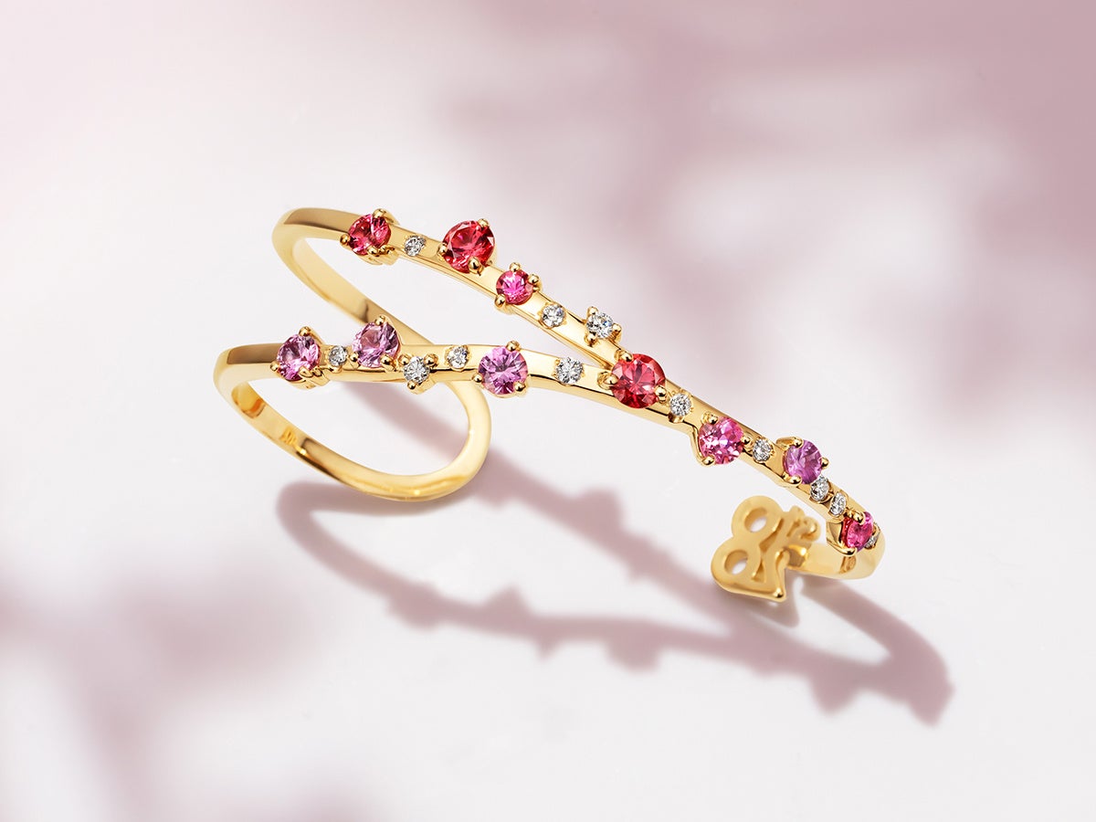 国内店舗限定で販売する「マルチカラージュエル K18イエローゴールドバングル・サクラ」(税込1,320,000円)は、日本の「花見文化」から着想を得たジュエリーです。濡れたような艶めきとビビッドな蛍光色を感じる「ピンクスピネル」と、透明度が高く発色の美しい「ピンクサファイア」を使い、月明りに照らされる夜桜を表現しています。枝の上で咲き誇る満開の桜の華やかさと、キラリと光るダイヤモンドが、優美なデザインです。