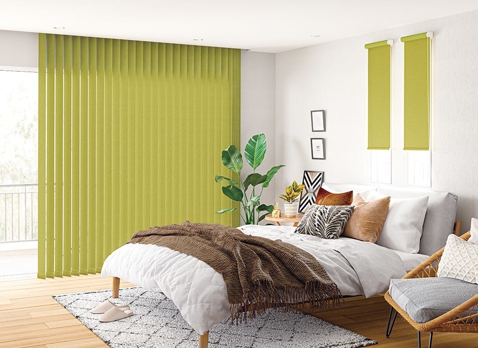 バーチカルブラインドとロールスクリーンで同⾊の⽣地を使⽤し、統⼀感のある空間に。