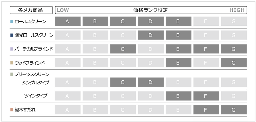 全商品に対し、製作サイズ⼱2,000mm、⾼さ2,000mmの場合の価格をA〜Gからなる7つのランクに分類しました。6種類のメカ全ての価格を共通化することで、⽐較がしやすく、ご予算に合わせて選びやすくなりました。