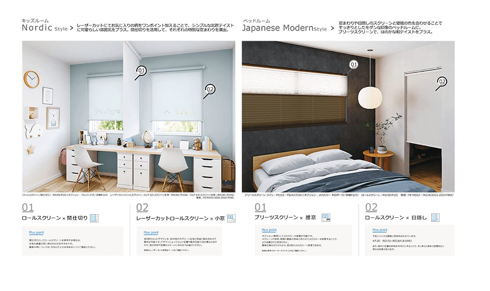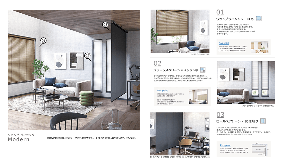 住宅で⼈気の⾼まるFIX窓やスリット窓といった窓種類に適したアイテムや、間仕切りとしての活⽤など、ニーズに応じた使⽤⽅法を紹介するとともに、インテリアスタイル別のコーディネートを掲載することで、理想の空間づくりをサポートします。