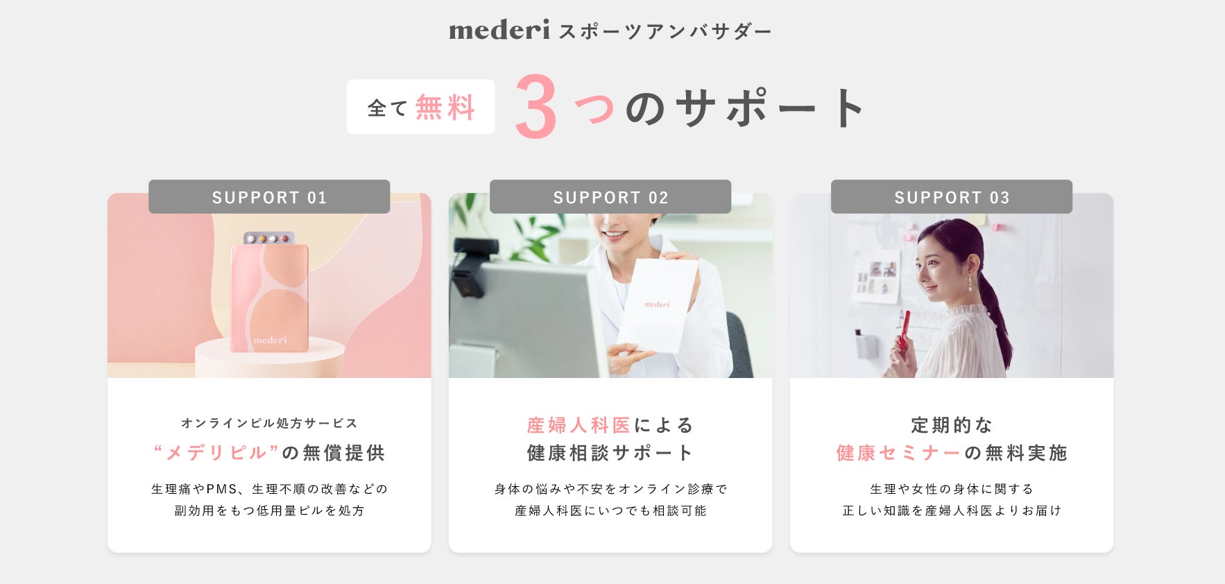 生理痛、生理不順、出血、気持ちの浮き沈み…毎月訪れる女性特有の健康課題について、個人単位でケアするだけではなく、チーム全体として真摯に向き合い、産婦人科医も含めた正しい知識や対処法を共有できる体制があれば、よりスマートに安心してスポーツに打ち込める女性が増えるきっかけになるかもしれません。フェムテック、低用量ピルを切り口に「女性の生きやすさ」の実現を目指すmederiでは、スポーツの世界で挑戦する女性たちに敬意を払い、「mederiスポーツアンバサダー」を通して、女子スポーツチームが抱える生理やPMSなどの健康課題を全力でサポートします。またアスリートの皆さまへのインタビュー記事を通して、表には出てきづらい生理/PMSや女性の体に関する課題について考えるきっかけを提供します。