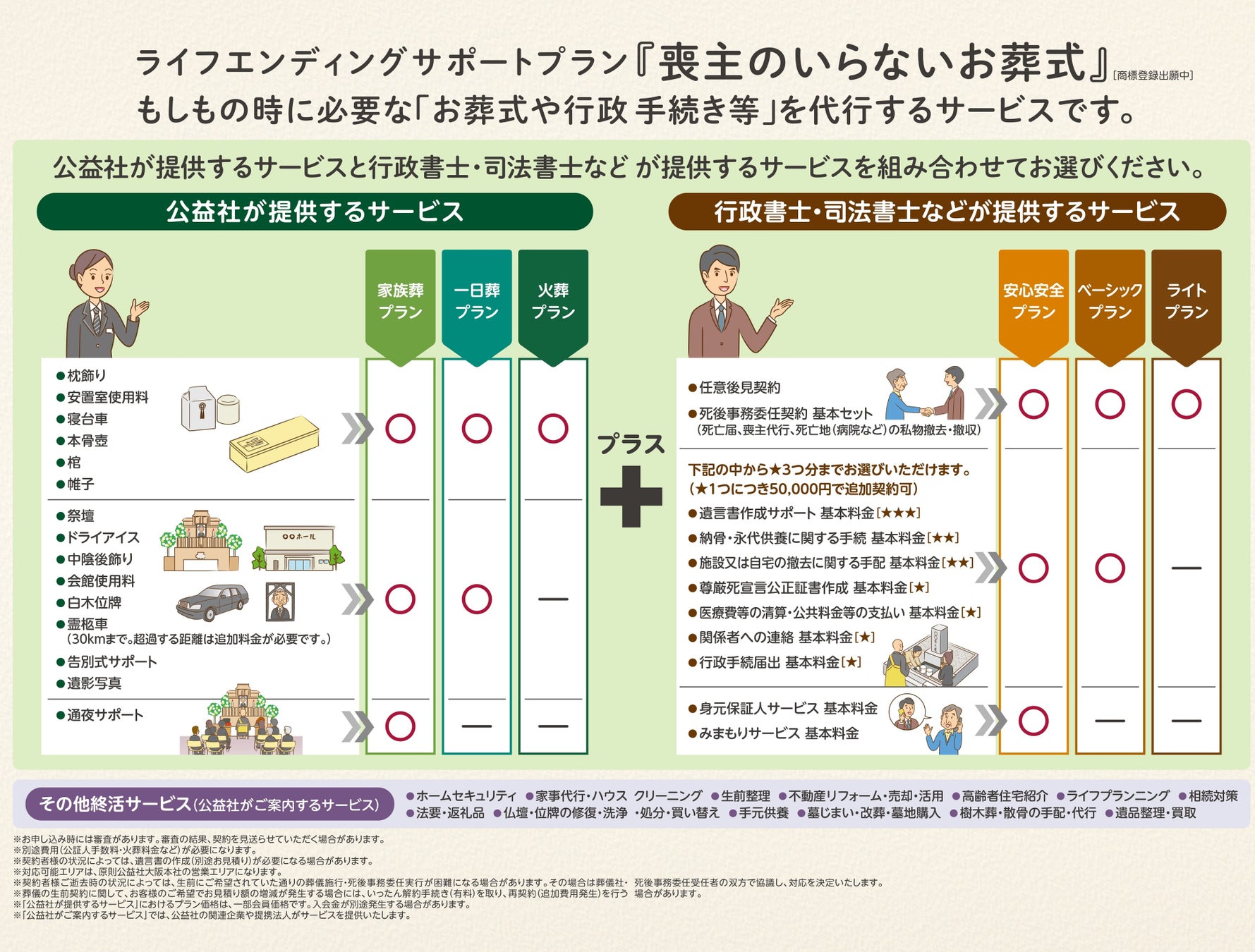 下記の公益社が提供するサービスと行政書士・司法書士などが提供するサービスを組み合わせて利用。