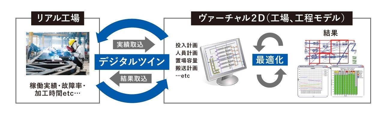 「投入計画最適化モジュール」では、生産シミュレータを活用して、実際の工場ラインのモデルをデジタル上に構築。実態に合ったシミュレーションを短時間で行います。これまで熟練者による「カン・コツ」で行われてきた様々な判断基準をデジタル化し、無数にある複雑な投入計画の中から最適なものを算出するサービスです。