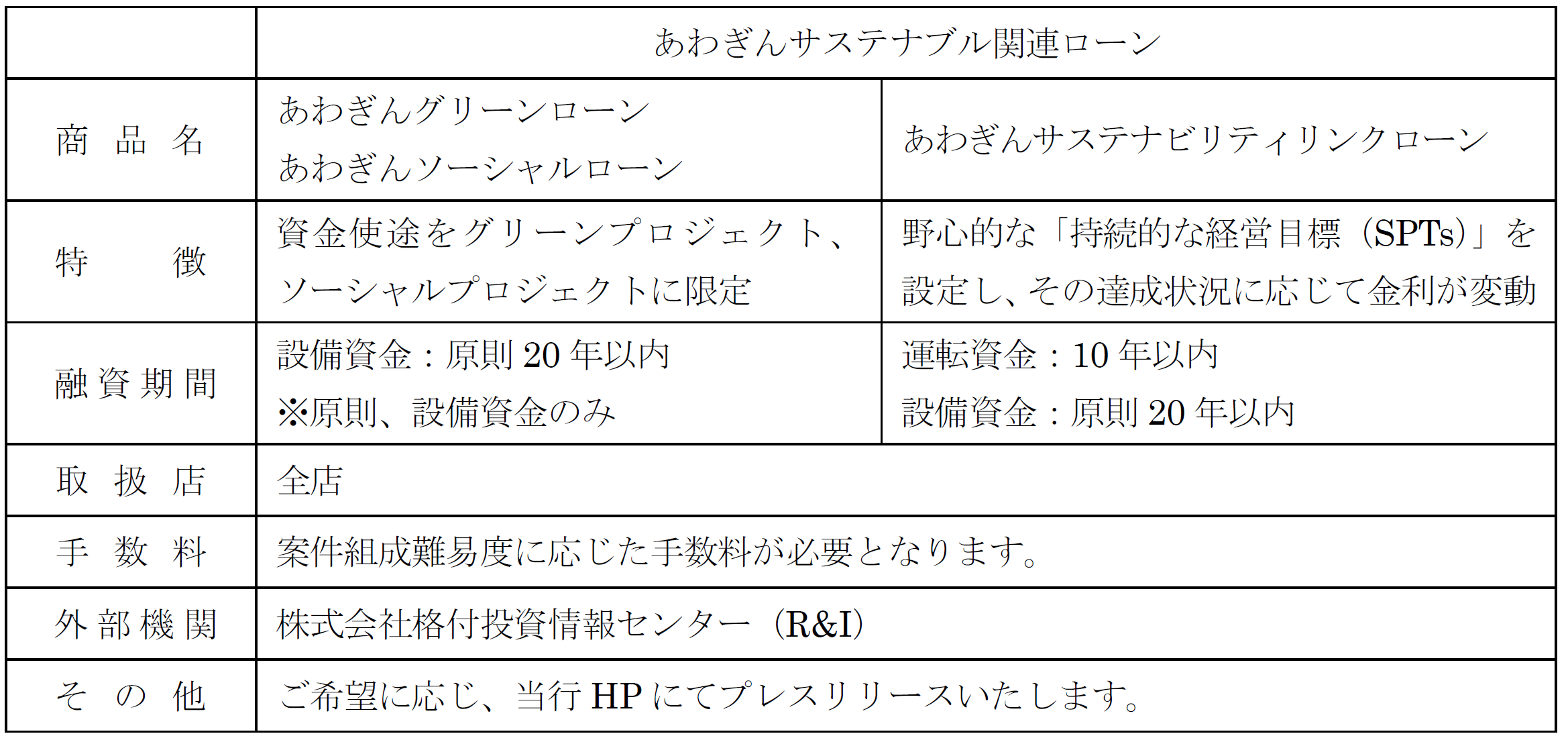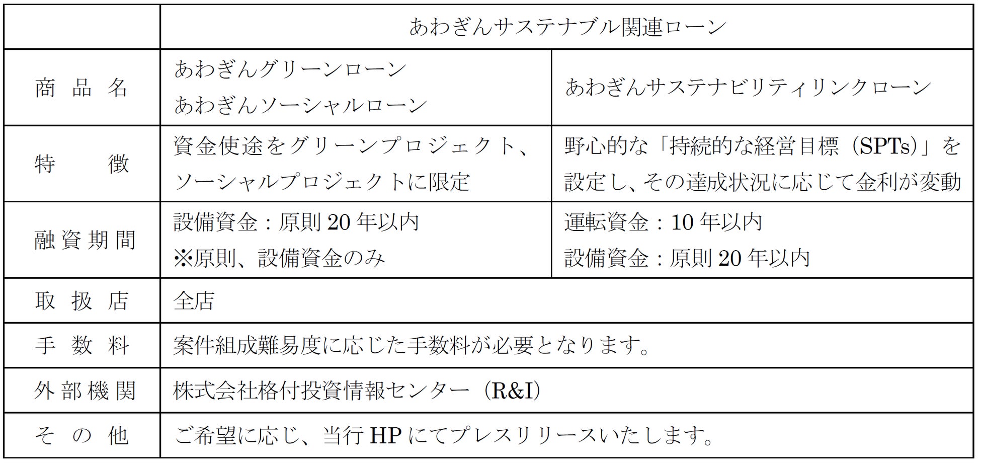 当商品は、資金使途をグリーンプロジェクト、ソーシャルプロジェクトに限定した「あわぎんグリーンローン」「あわぎんソーシャルローン」と、環境保全や持続可能な社会の実現等に向けた経営目標を設定し、その達成状況に応じて金利が変動する「あわぎんサステナビリティリンクローン」の3つの商品からなる融資フレームワークです。