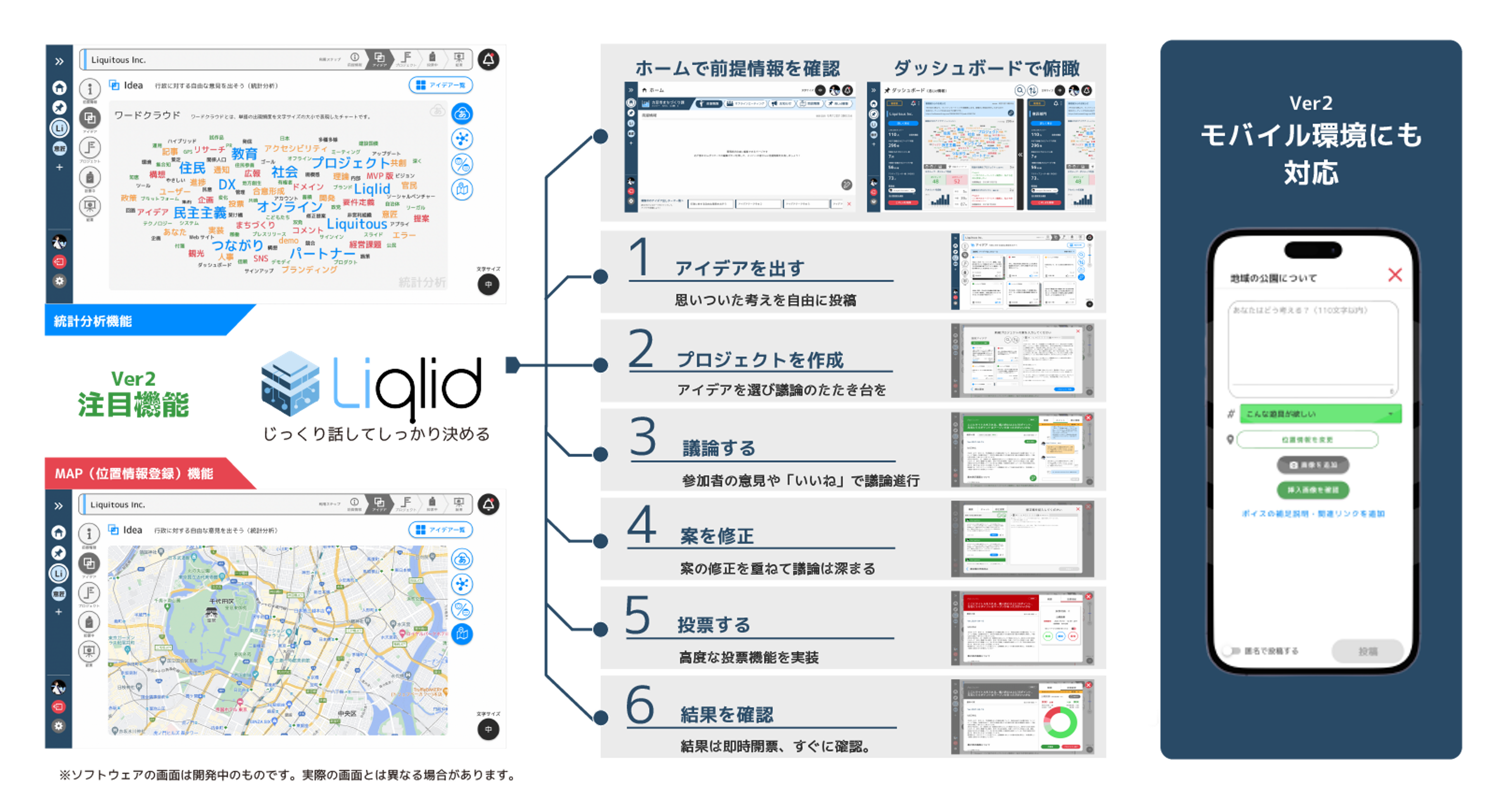 Liqlidは、ブラウザ上で動作し、ダウンロード・インストール等不要で、市民と行政をつなぎ、市民発のアイデア出しからプロジェクトの共創、意向調査までを一気通貫で行うことができます。