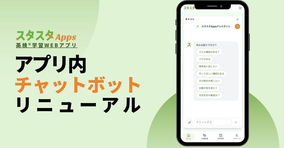 スタディスタジオ株式会社(本社:東京都渋谷区、代表取締役:鈴木孝一)が運営する英検®学習支援Webアプリ「スタスタApps」は、アプリ内チャットボット「スタスタAppsアシスタント」をリニューアルしました。2026年2月10日より提供開始します。