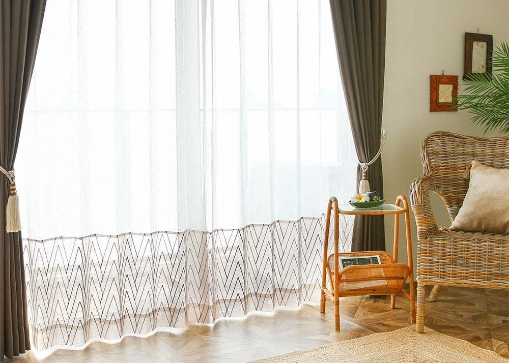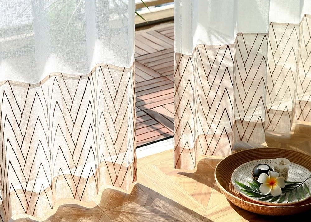 ナチュラルな素材感と裾に施された刺繍が、アジアンな雰囲気を演出してくれるレースカーテンです。光を通したときに、床に映し出されるヘリンボーン柄のデザインがなんとも魅力的!