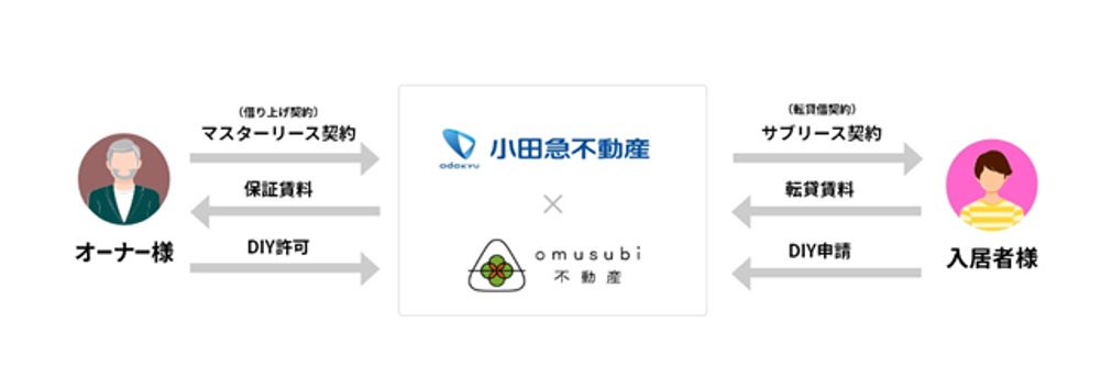 小田急不動産が、物件オーナーから空き家を借り上げ、omusubi不動産がDIY可能な賃貸物件として入居者を募集・貸し出すスキームで、賃貸物件で新たに入居者を募集する際に通常必要とされるクロスの張替えや古い設備の入れ替え等のリフォーム工事を未実施の状態で、入居者に転貸(サブリース)します。