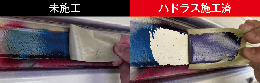 ▲コーティング施工あり/施工なしを粘着テープにて、塗装を剥がす模様