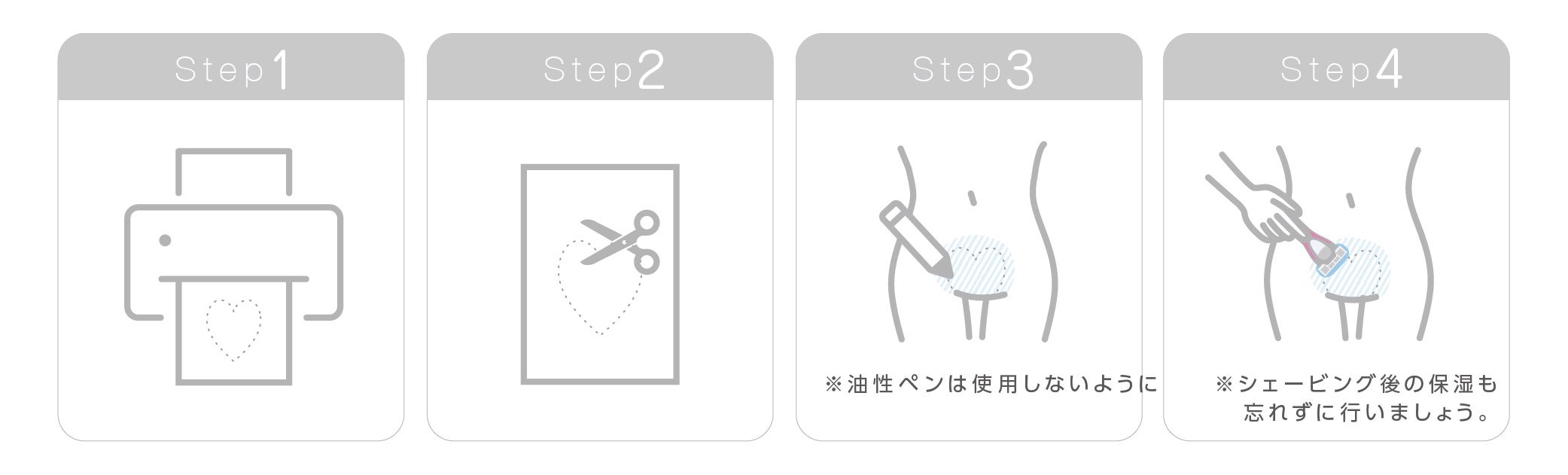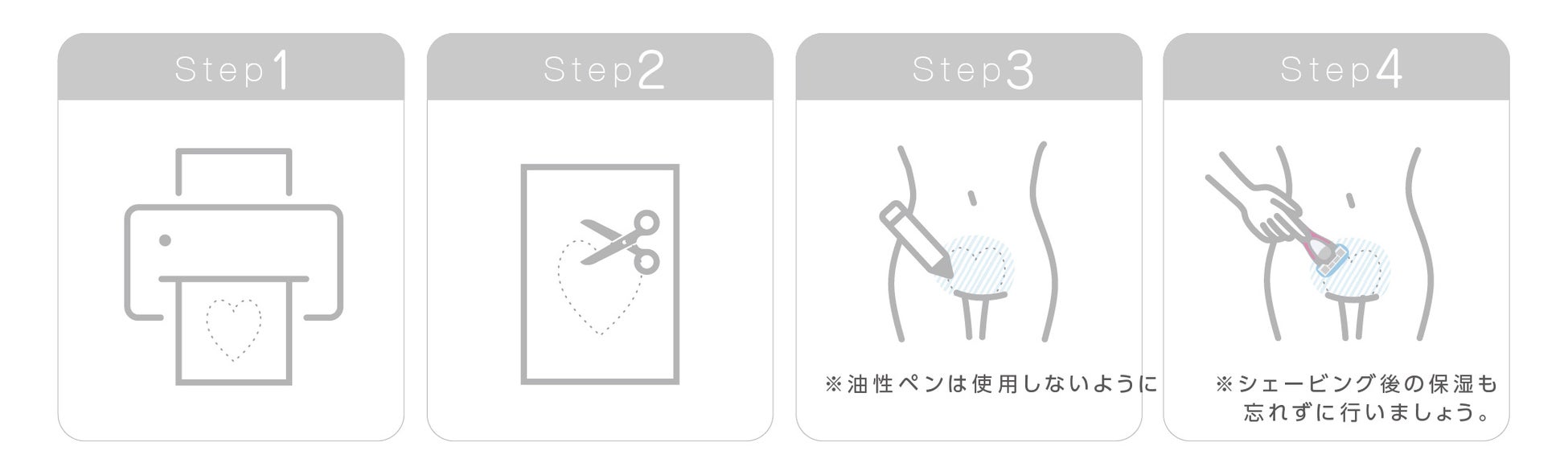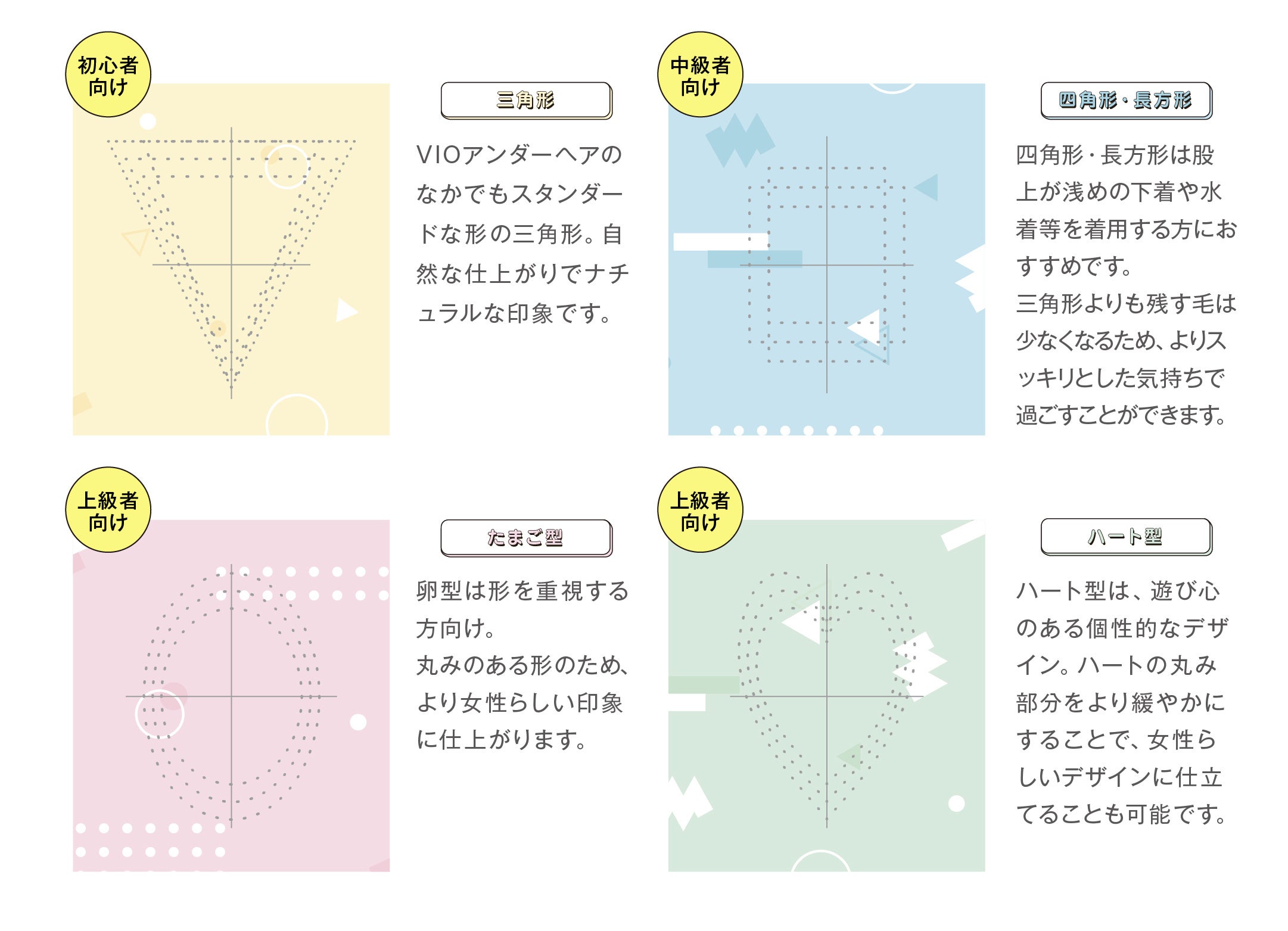 VIOヘア・テンプレートは4種類の形を用意し、その時々に身に着けたい下着やファッション等に合わせて、自分の好みに合うアンダーヘアの形を見つけることができます。テンプレートを使用することで、自宅にいながら思い通りの形に仕上げることができます。
