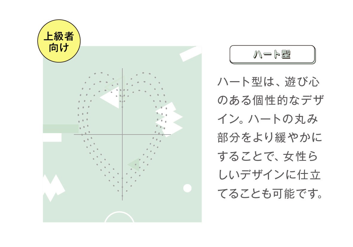 ハート型は、遊び心のある個性的なデザイン。ハートの丸み部分をより緩やかにすることで、女性らしいデザインに仕立てることも可能です。
