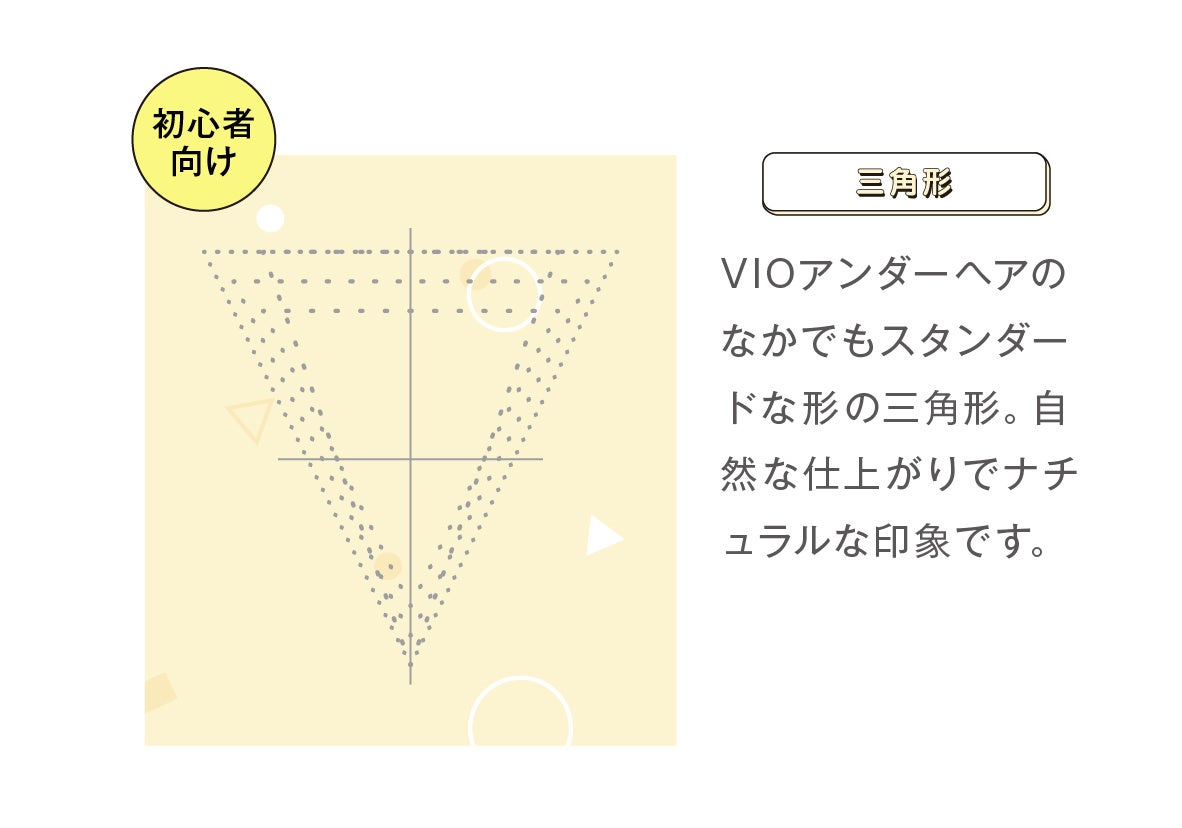 VIOアンダーヘアのなかでもスタンダードな形の三角形。自然な仕上がりでナチュラルな印象です。【中級者向け】四角形・長方形