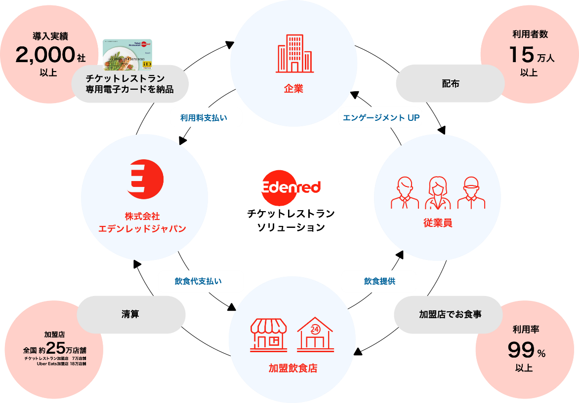 エデンレッドジャパンの「チケットレストラン」は、レストラン、カフェ、ファミリーレストラン、コンビニエンスストアなどの加盟店で⾷事や飲⾷物の購⼊ができるICカードタイプの⾷事補助サービスで、従業員の福利厚⽣として利⽤されています。⽇本で35年以上の実績を誇り、国内最⼤規模の⾷事補助ソリューションで、導⼊実績2,000社以上、利⽤者は15万⼈に達します。また2023年3月のUber Japanとの業務提携により、全国のご利用者様へ Uber Eats を介したデリバリーサービスを開始し、利用可能店舗は、全国約25万店舗へと飛躍的に拡大しました。
