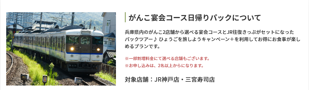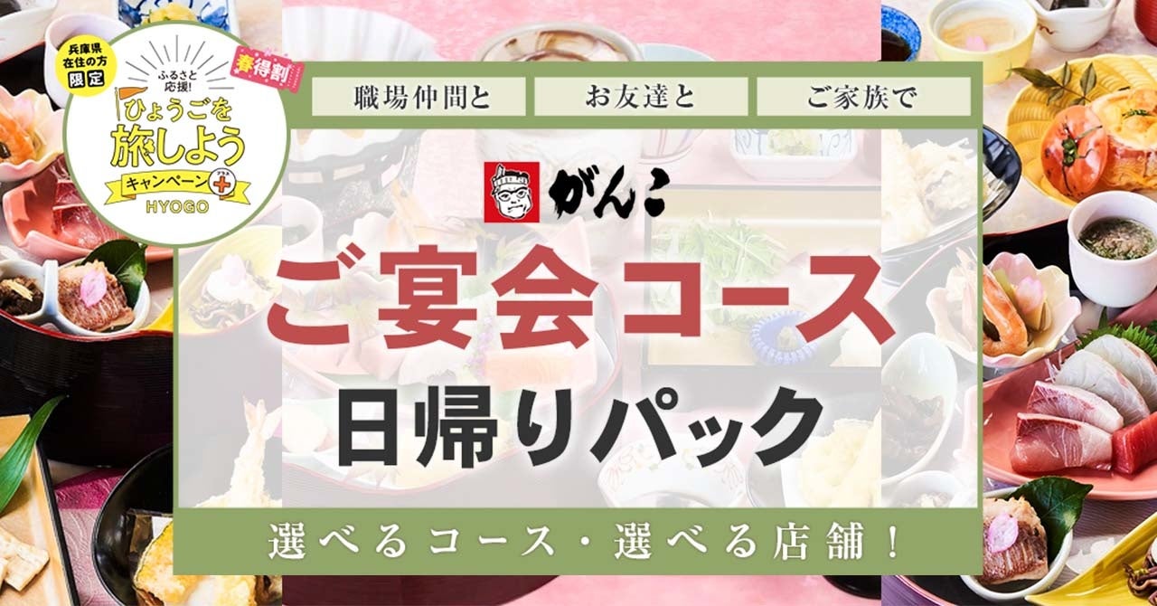 兵庫県内のがんこ2店舗から選べる宴会コースとJR往復きっぷがセットになったパックツアー♪ ひょうごを旅しようキャンペーン+を利用してお得にお食事が楽しめるプランです。