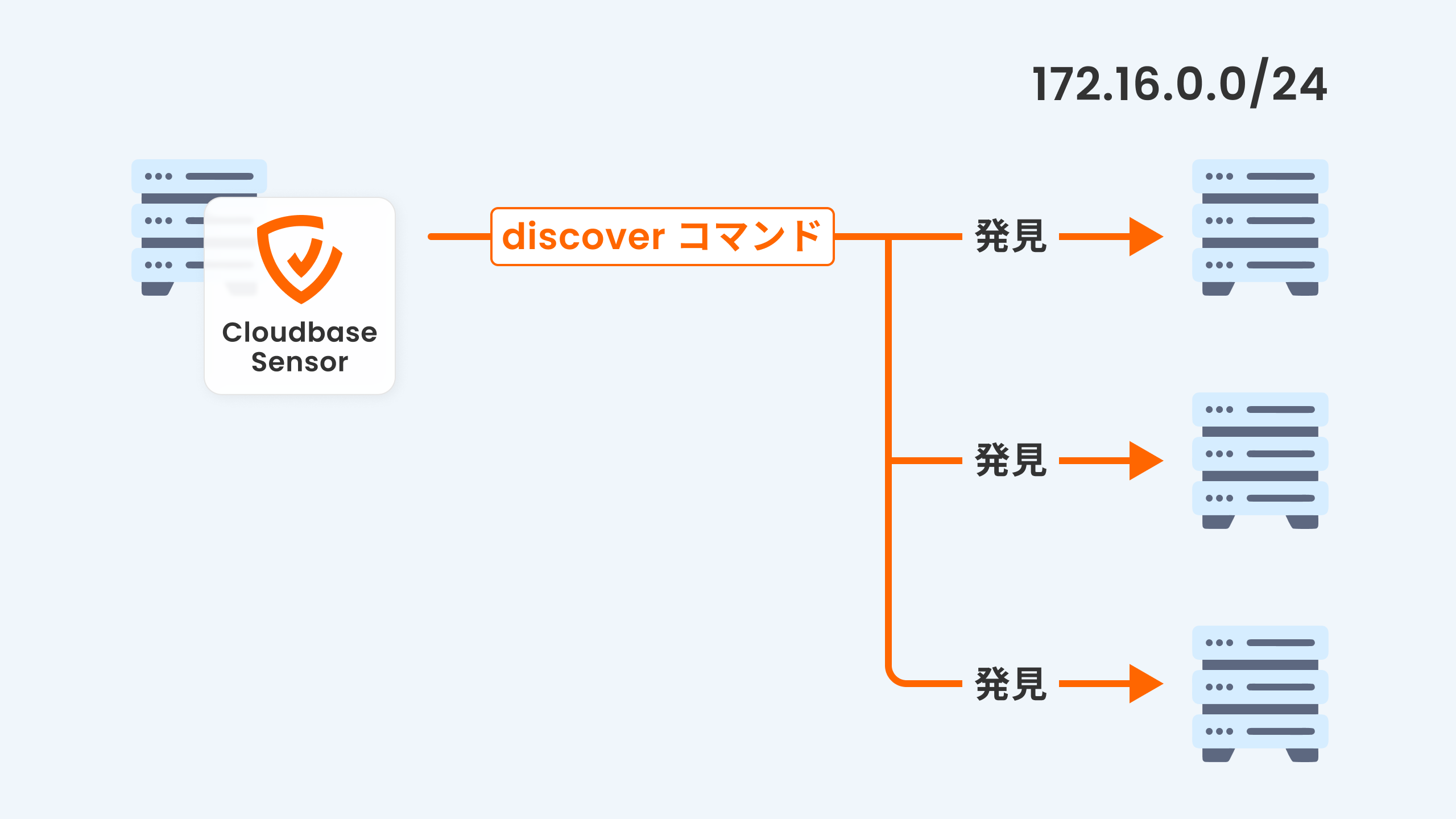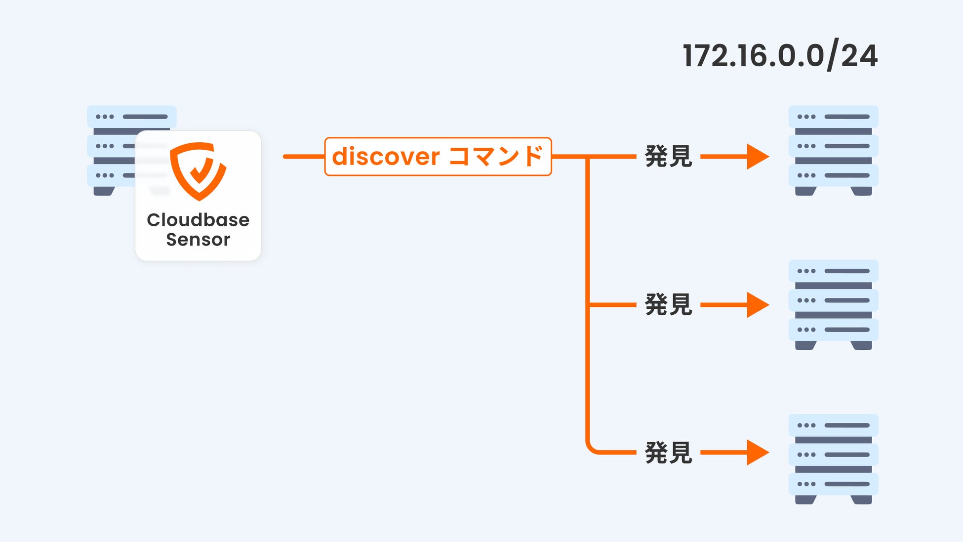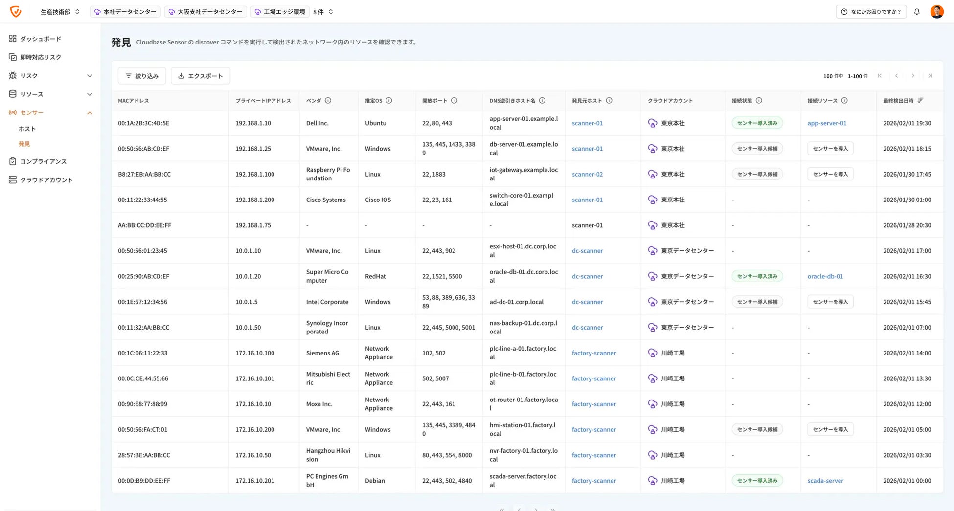 組織のネットワーク内にある資産を自動で検出する「発見」機能は、Cloudbase Sensorを通じて同一ネットワーク内の資産を自動的に検出し、IPアドレスやMACアドレス、推定OSなどの情報を収集します。