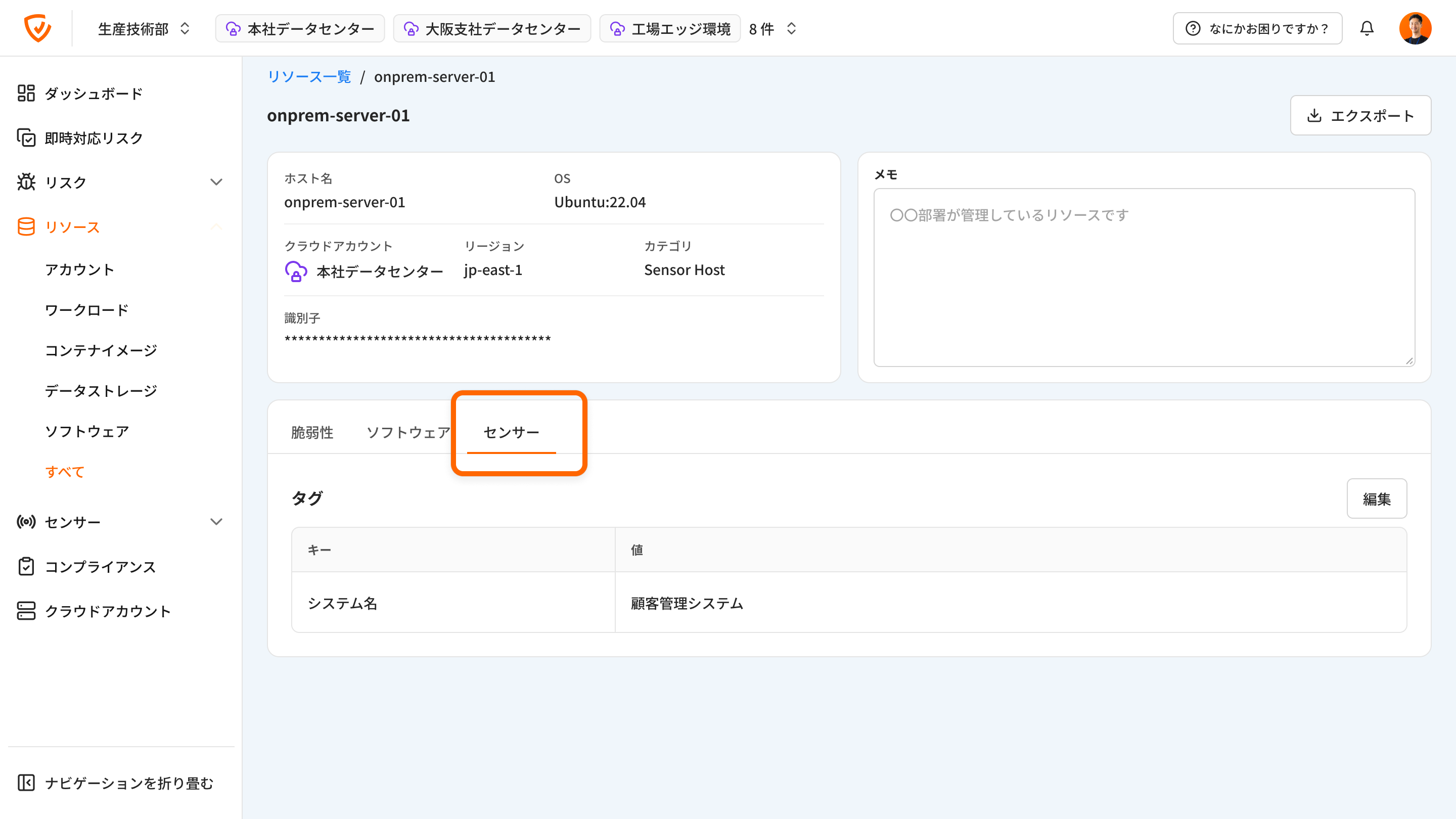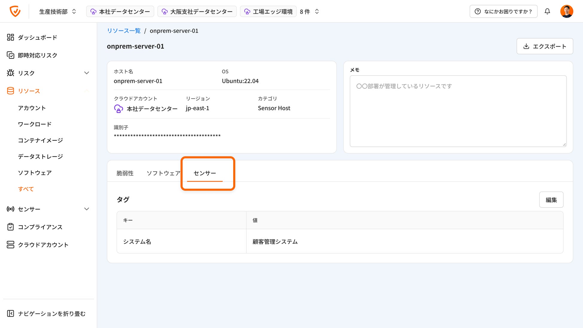 リソース詳細画面の「センサー」タブよりタグの表示・編集を行うことも可能です。