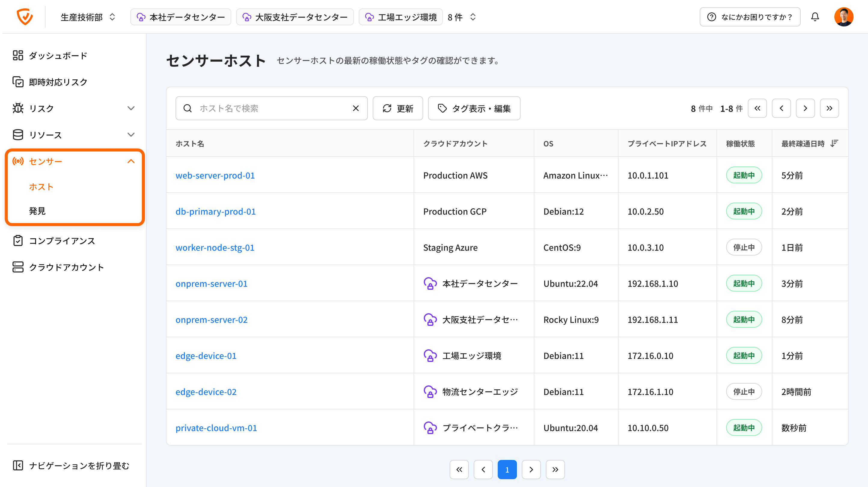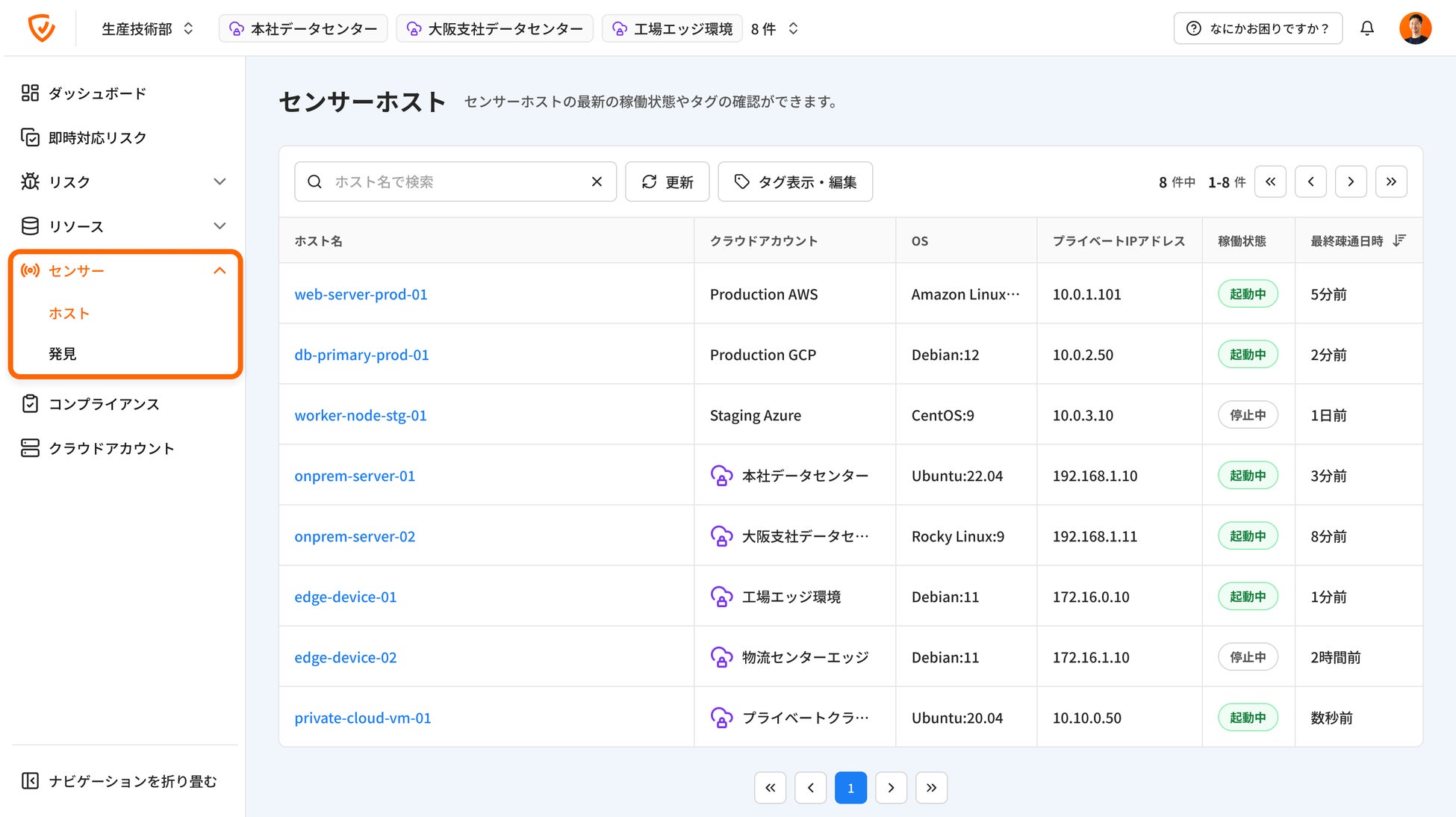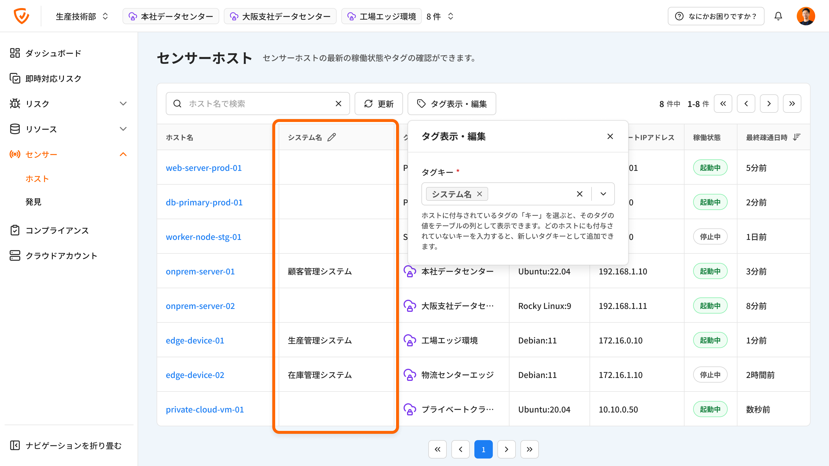 「センサーホスト」画面のリリースにより、Cloudbase上で全てのSensorの稼働状況を一覧で確認できるようになりました。 また、各Sensorに対してタグを付与することで、資産台帳との紐付けや部署情報の管理など、組織固有の情報を柔軟に管理できます。