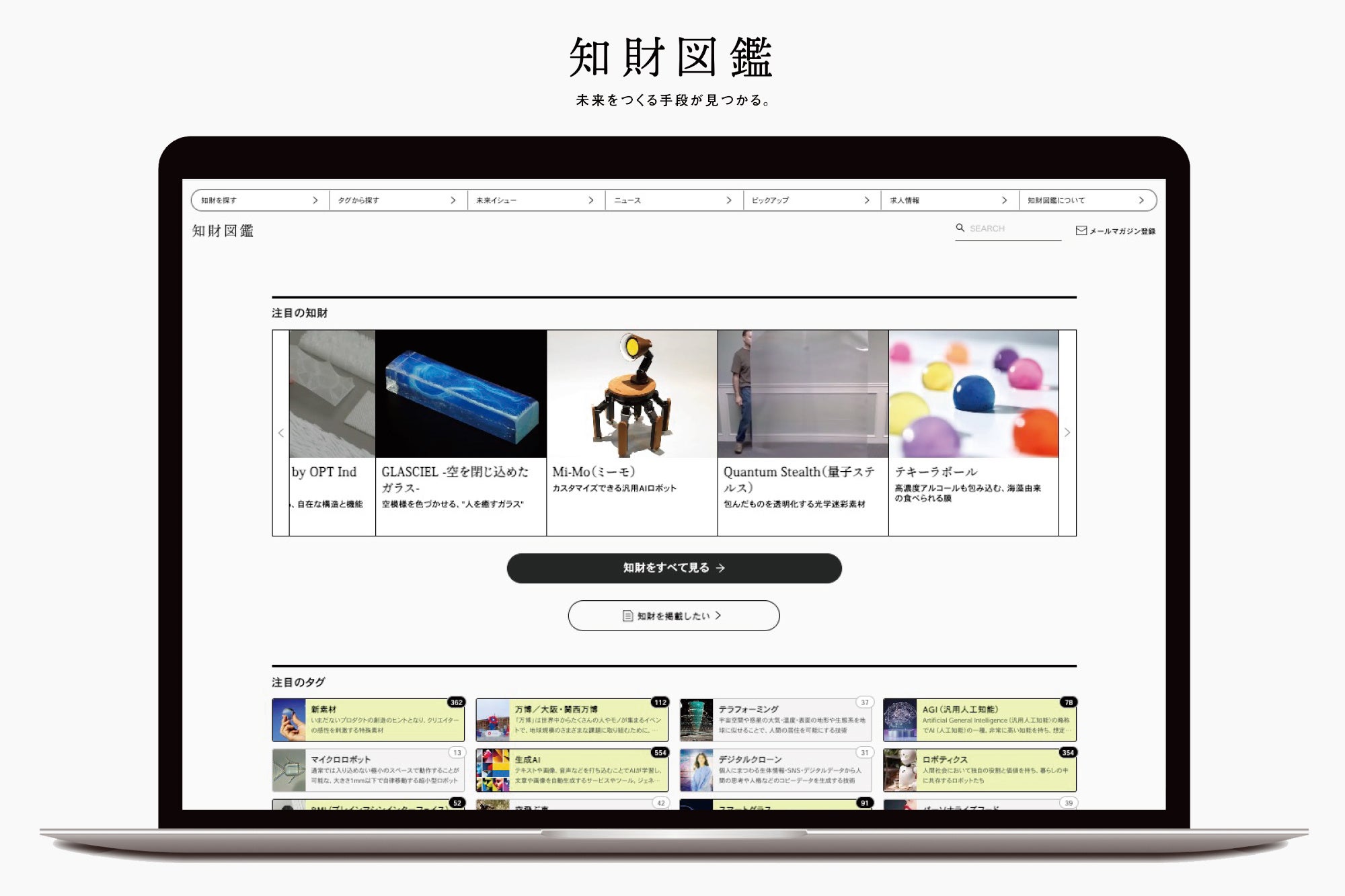 知財図鑑は「世界を進化させる知財」に出会えるイノベーションメディアです。データベースとしての機能に留まらず、クリエイター視点で知財を翻訳する「知財ハンター」を組織し、新規事業のためのAIコンサルティングやマッチングを行います。多分野で培ったクリエイティブの知見を活かし、先端技術や未来の課題を横断し、様々な産業における事業創出をサポートしています。