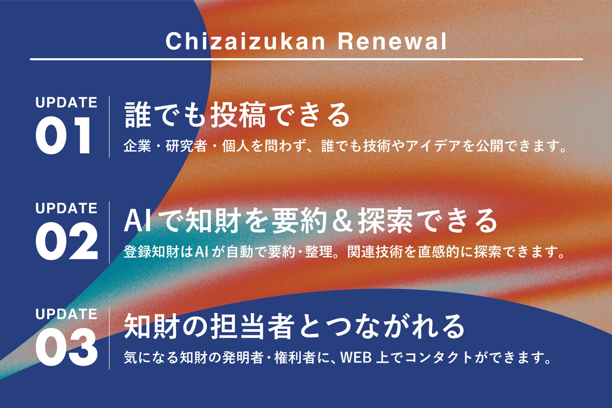 本プロジェクトでは、知財図鑑のWebサイトを全面的にリニューアルし、誰もが技術情報を投稿・探索・接続できるオープンな知財プラットフォームへと転換します。これまで編集部が担ってきた「技術を翻訳して届ける」という役割をひらき、企業・研究者・個人を問わず誰でも参加できる仕組みへと器ごと変えます。主なアップデートは以下の3点です。