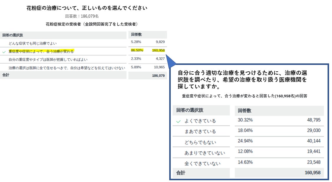 今回、約18万人の受検者の回答分析により、花粉症の治療方法に関して正しい回答をしている方が87%であるにも関わらず、そのうちの48%の方しか適切な治療への行動がとれていないことがわかりました。*1