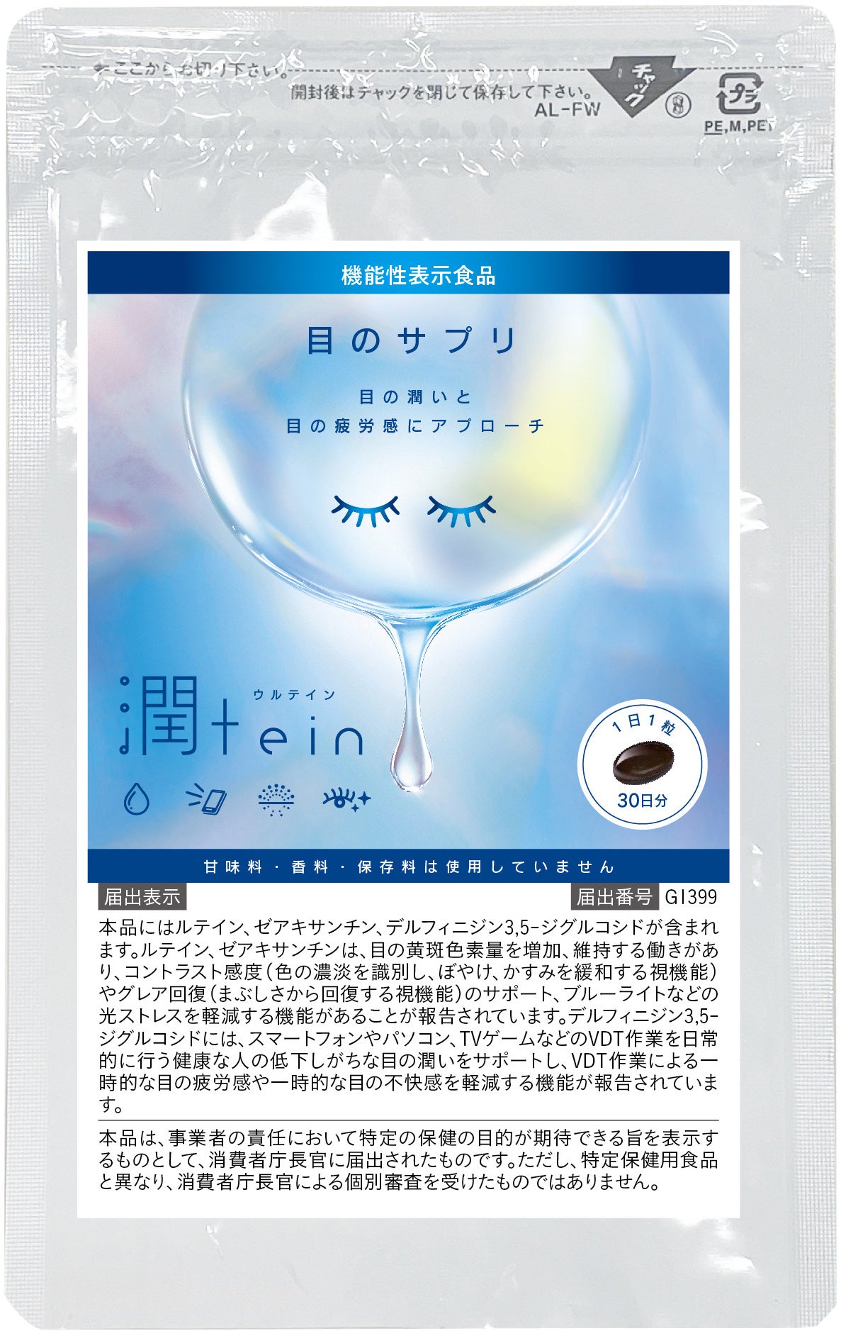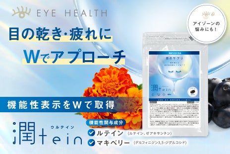 化粧雑貨、化粧品、服飾雑貨、及びキャラクター雑貨等の企画・製造・販売、コンタクトレンズの企画・販売を行う粧美堂株式会社(本社:東京都港区、代表取締役社長:寺田正秀、以下粧美堂)は、目の疲労感や不快感、ブルーライトなどの光ストレスを軽減し、ぼやけ、かすみを緩和、目の潤いをサポートする機能性表示食品「潤tein(ウルテイン)」を2022年9月27日(火)に自社ECオンラインショップにて新発売いたします。