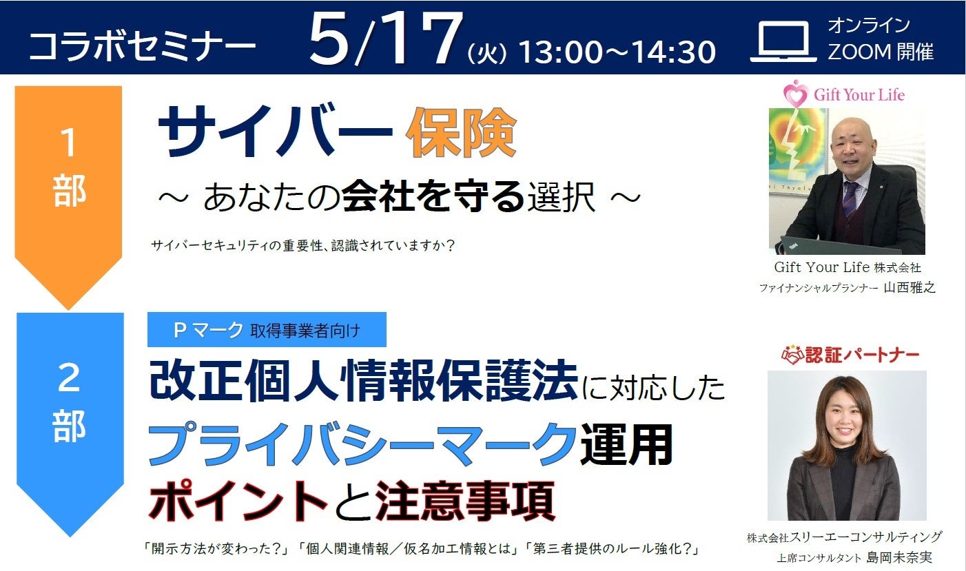 大好評のため3回目!コラボセミナー2部【Pマーク取得事業者向け】改正個人情報保護法に対応したプライバシーマーク運用のポイントと注意事項を解説 5/17(火)13:00~無料ウェビナー