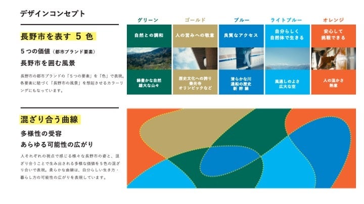 デザインでは、長野市を象徴するモチーフから着想した5つの色で長野市の5つの価値を表現しました。雄大な自然に囲まれながら、他者を尊重し合い、様々な場所を自由に行き来することができることを表しています。また、混ざり合う曲線で、あらゆる可能性が生まれる長野市の多様性を表したデザインとなっています。