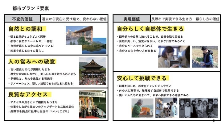 市民参加によるワークショップや市民アンケートのほか、今後の長野市を創っていくプレーヤーである起業家、クリエーター、若い世代の代表者などと検討を進め、長野市の持つ価値を5つに整理しました。