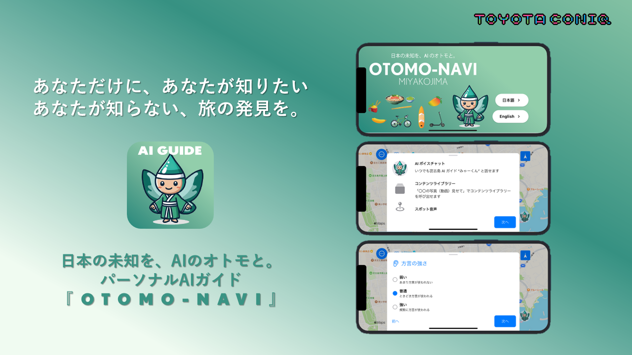 トヨタ・コニック・プロ株式会社(本社:東京都千代田区、代表取締役社長:山下 義行、以下「トヨタ・コニック・プロ」)は、地域課題の解決による地域創生プロジェクトにおける観光領域の取り組みとして、沖縄トヨタ自動車株式会社(本社:沖縄県浦添市、代表取締役:野原 朝昌、以下「沖縄トヨタ」)との協働で、地域とともに創る観光コンテンツと、音声・位置情報を活用した検索AIを掛け合わせることで ”みゃーくぴとぅ(宮古人)だけが知る、みゃーく(宮古)の魅力を、みゃーくふつ(宮古方言)で話すパーソナルAIガイド“ による「あなただけに、あなたが知らない、あなたが知りたい、旅の発見」を提供する観光サービス『OTOMO-NAVI(オトモナビ)』を12月19日(木)より、宮古島北部エリアにて期間限定で実証いたします。