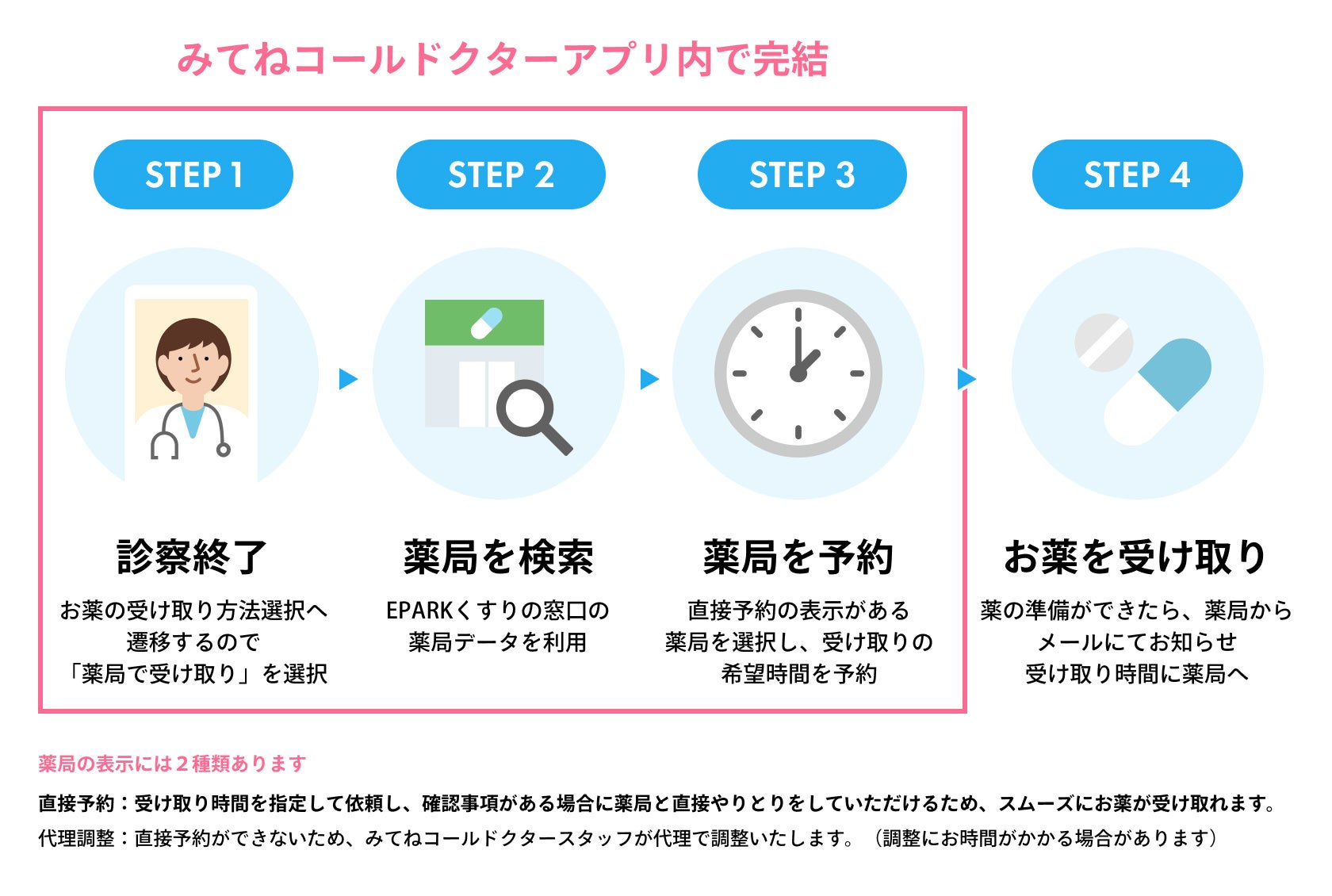 本連携により、「みてねコールドクター」でオンライン診療を受診した患者は、EPARKくすりの窓口が提供する全国約61,000店舗の薬局データをもとに、薬を受け取る薬局をスムーズに検索・選択できるようになります。さらに、処方箋ネット受付に対応している全国約21,000店舗の薬局については、「みてねコールドクター」アプリ上から薬の受け取り日時を予約することが可能となります。