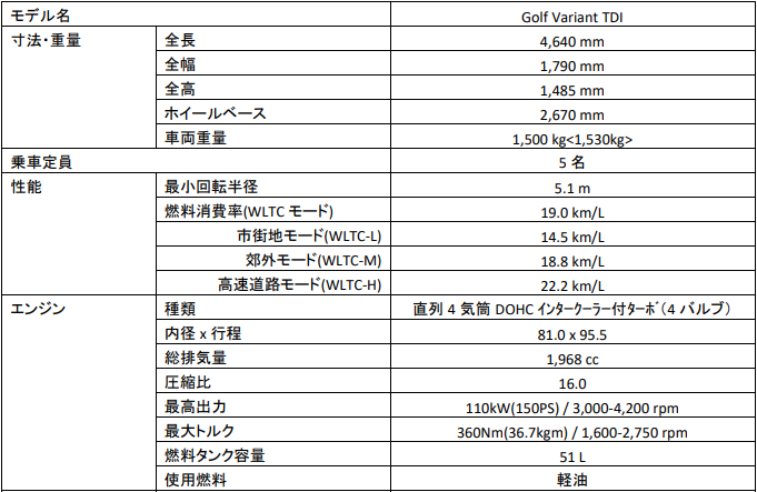 今回新たに追加するディーゼルエンジンは、すでに昨年末に導入した新型「Golf TDI」に採用されているエンジンと同じ、最新世代のディーゼルエンジンです。最新のテクノロジーとなるツインドージング(デュアルAdBlue噴射)システムを採用することで、窒素酸化物(NOx)の排出量を大幅に削減すると同時に、最大トルクを360Nmまで高め、クリーンな排出ガスと高いパフォーマンスを高次元で両立しています。また、燃料消費率も先代より大幅に改善され、WLTCモードで19.0km/lを達成します。