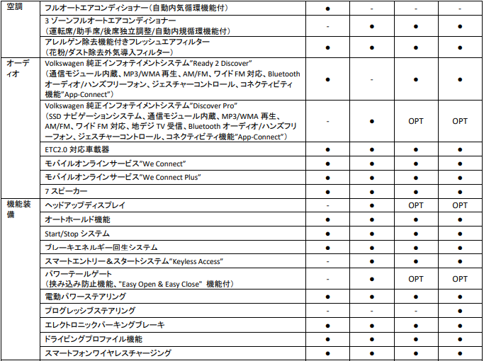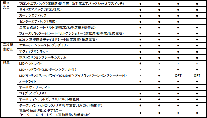 諸元表や主要装備表、オプション体系などは以下をご参照ください。