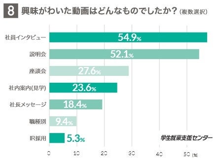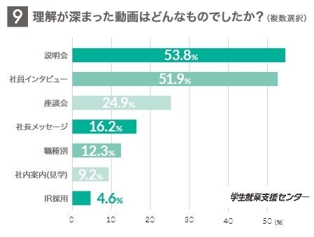 一方、設問9では選考や内定承諾につながるコンテンツとして「理解が深まった動画」について聞いたところ、「説明会」53.8%「社員インタビュー」51.9%「座談会」24.9%が上位を占めました。